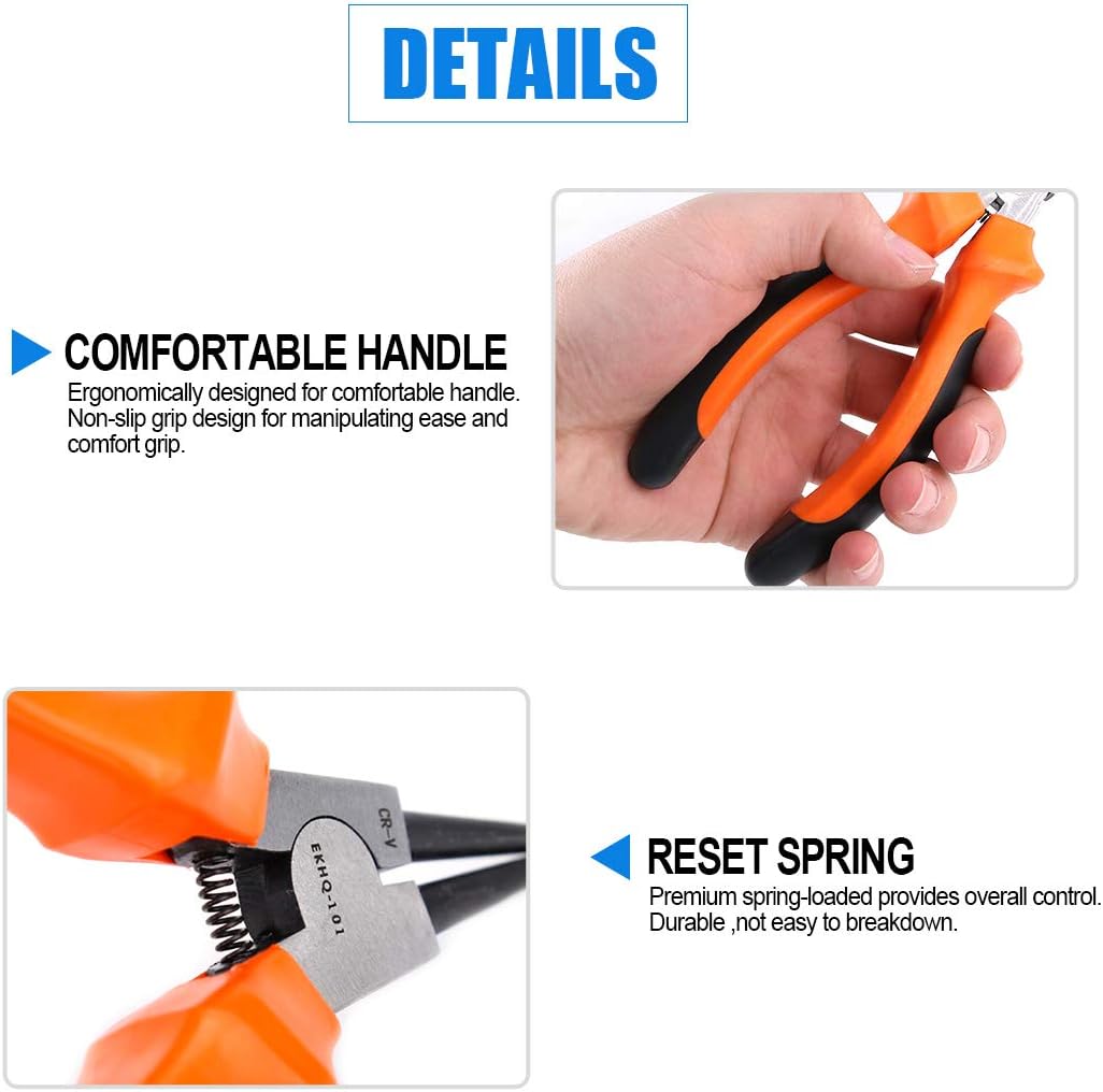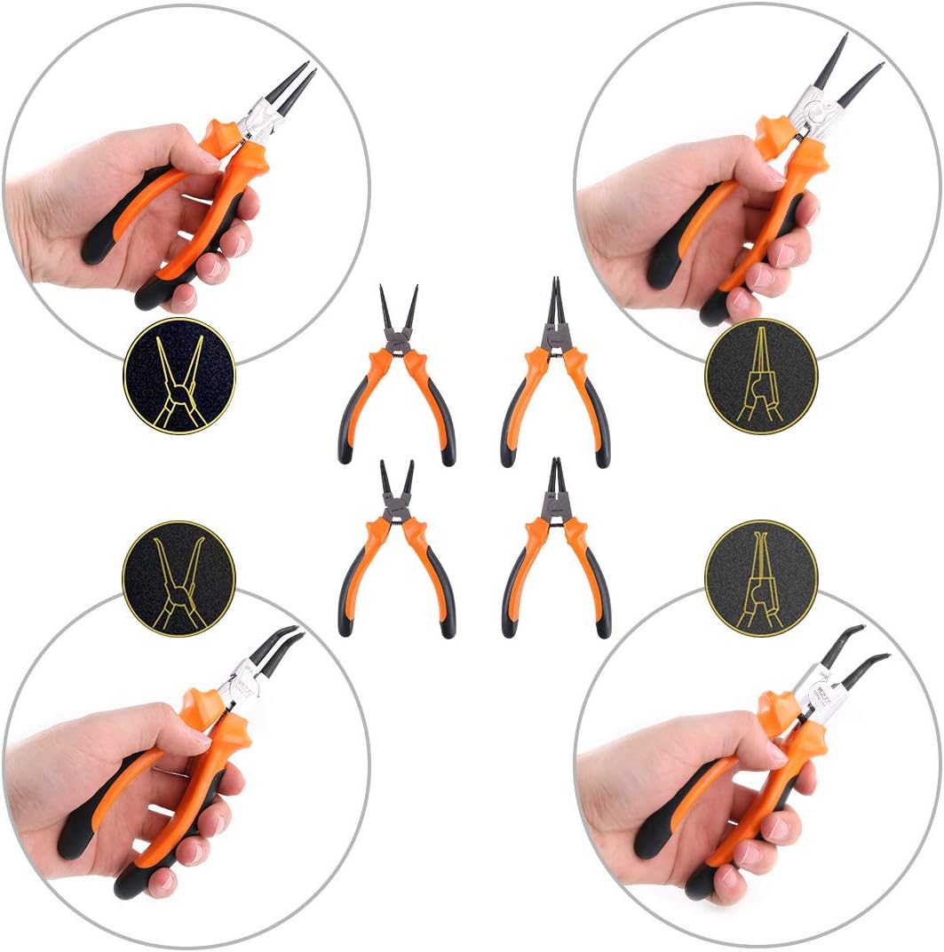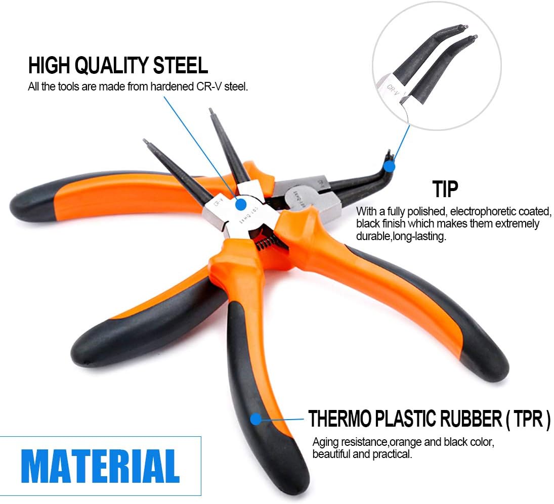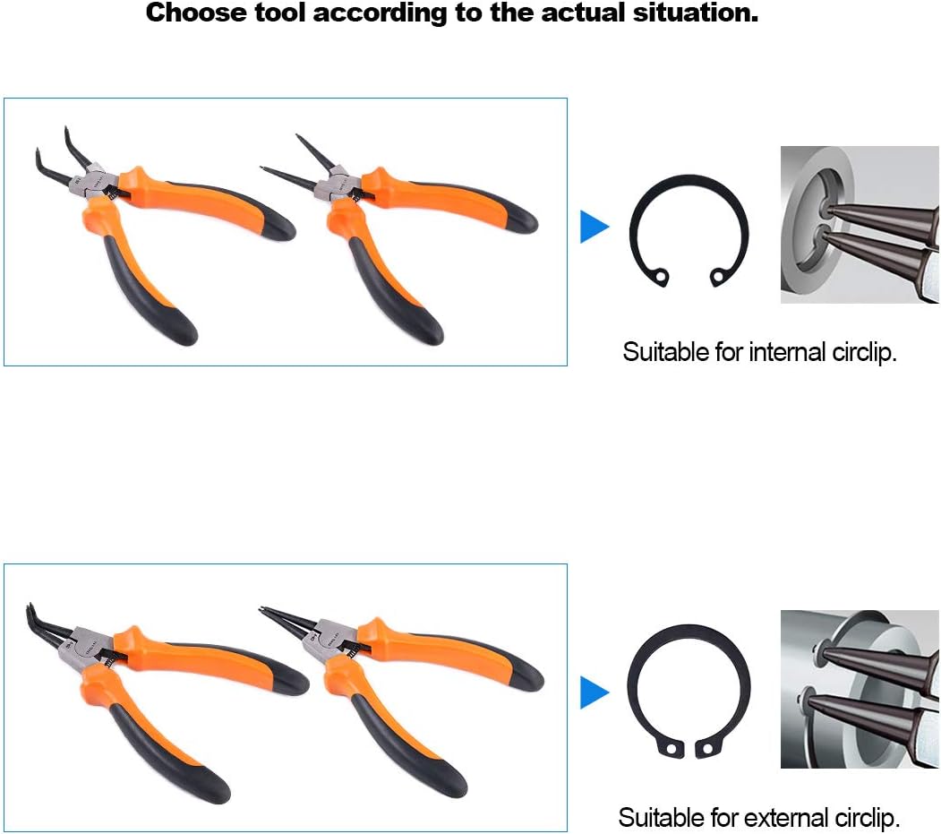 - ★ What You Get: In this set, it include 7-inch straight tip internal circlip plier, 7-inch straight tip external circlip plier, 7-inch bent tip internal circlip plier, 7-inch bent tip external circlip plier total 4pcs snap ring pliers well packaged in