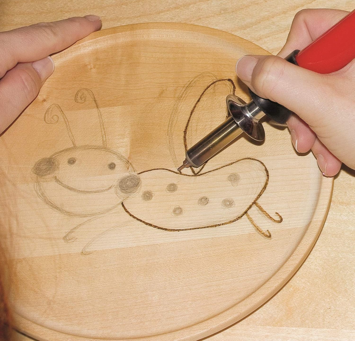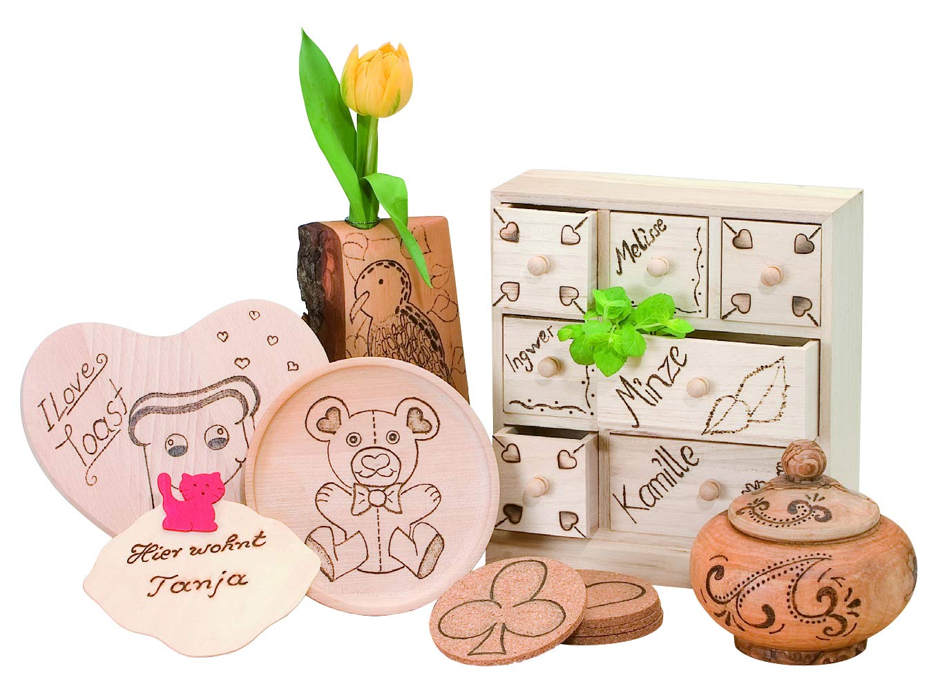 • Brennt auf Holz, Leder, Kork und anderen Materialien