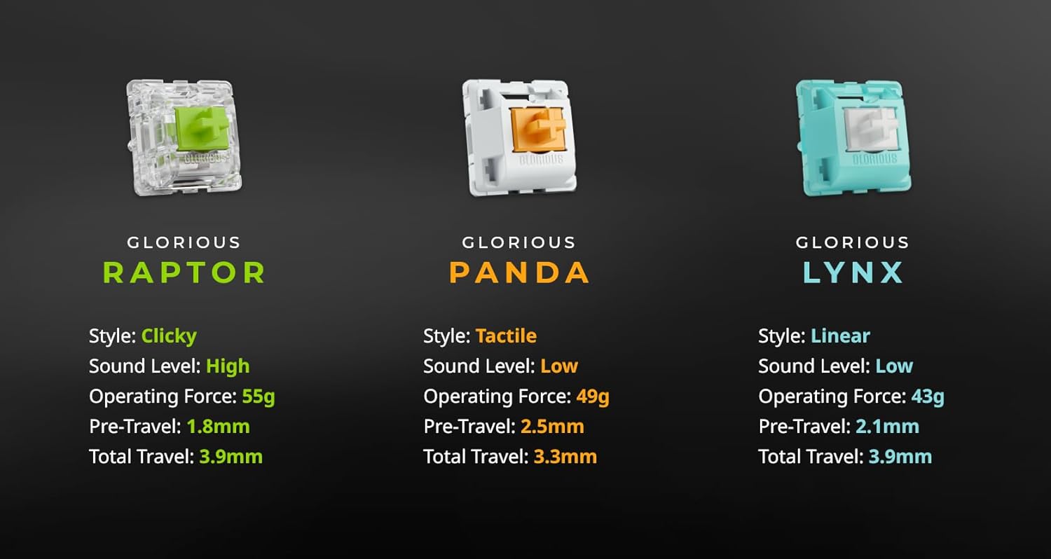 - Legendäres Tastengefühl: Die Glorious Panda-Schalter werden mit einer speziellen, von Tastaturliebhabern sehr geschätzten Form hergestellt und haben beim Drücken einen runden, fühlbaren Druckpunkt, der sich einzigartig bissig und reaktionsschnell