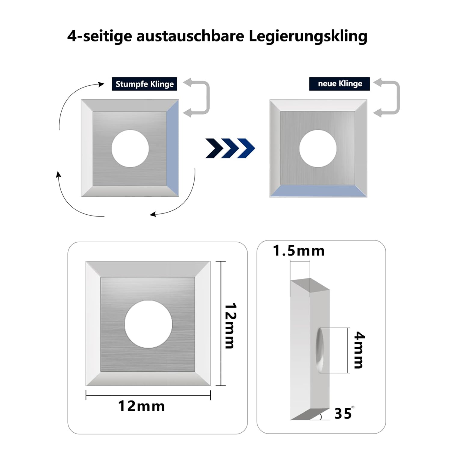 - Abmessungen: 12 x 12 x 1,5 mm, ideal für Drechseleinsätze und Hobelklingen.