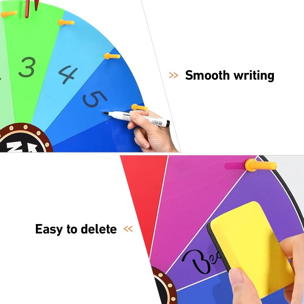 - 【Beschreibbar und Löschbar】Dieses Glücksrad verfügt über eine trocken abwischbare Oberfläche, verwenden Sie den Tafelradierer, um Kritzeleien und Text einfach von der Oberfläche des Preisrads zu löschen, sodass Sie die Spielregeln problemlos
