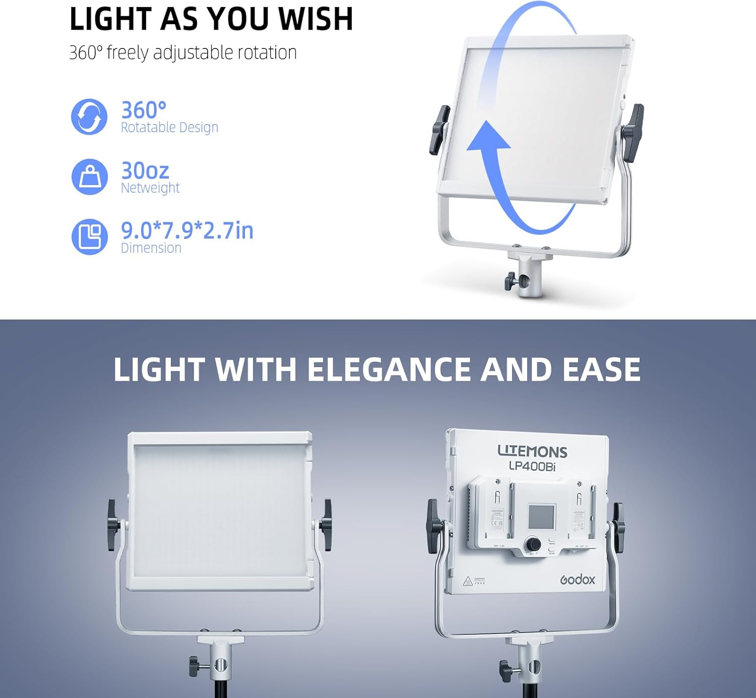 - Doppelte Farbtemperatur-Panel-Fotografie: LP400Bi unterstützt die freie Einstellung zwischen der Farbtemperatur 2800K-6500K