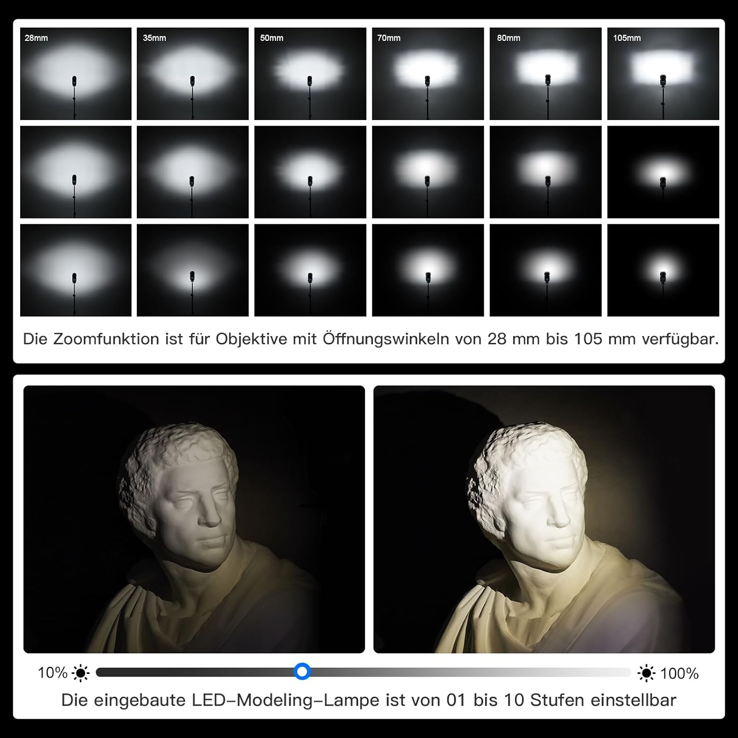 - đăRunder Fresnel-Kopf, exzellenter Lichteffektă Die GODOX V1 C Kamera blitz verfĂŒgt ĂŒber einen runden Fresnel-Kopf mit eingebautem LED-Einstelllicht, das von 01 bis 10 Stufen eingestellt werden kann und das Licht gleichmĂ€ssig von der Mitte zu