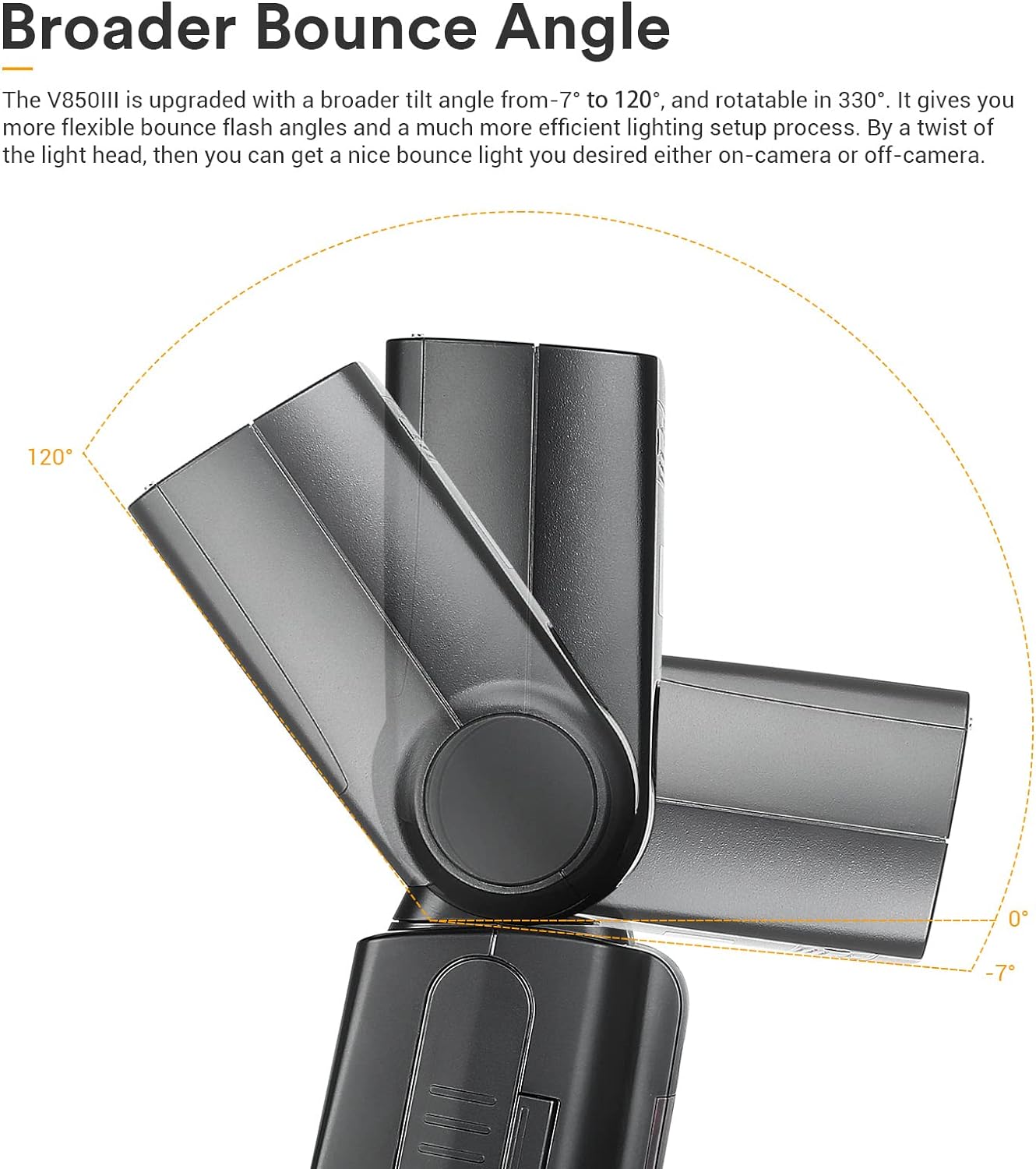 • 【Flexibler Aufnahmewinkel】 Mit dem Schwenkwinkel von 0° bis 330° horizontal und von -7° bis 120° vertikal können Sie mit der V850III ganz einfach direktes Blitzen, indirektes Blitzen und alle anderen Aufnahmetechniken durchführen.
