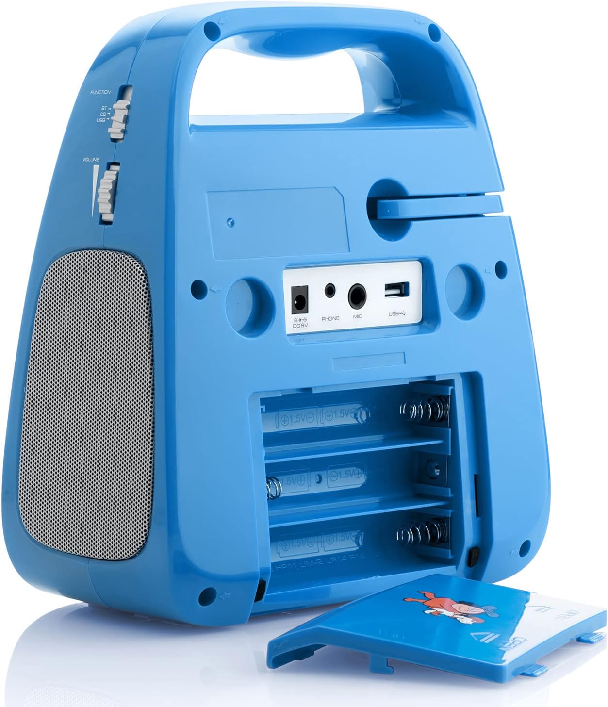 - Auf der Rückseite des Maxipes KARAOKE-Players befindet sich auch ein Platz zum Aufbewahren von Batterien, sodass Sie den Player mit in den Park oder auf den Spielplatz nehmen können.