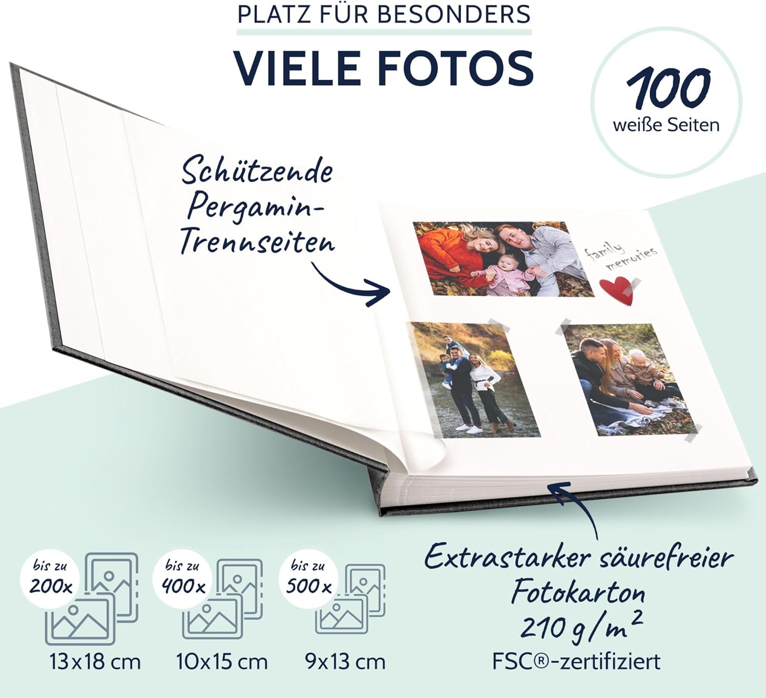 - Auf den Seiten können 400 Fotos im Format 10x15 cm oder 200 Bilder im grösseren Format von 13x18 cm eingeklebt werden. Das Photoalbum in Grau ist perfekt für eine individuelle Gestaltung