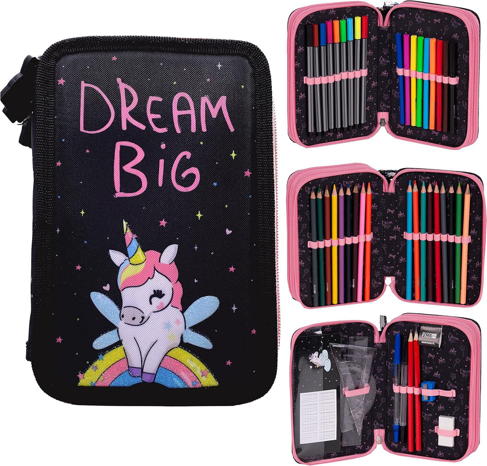 - Dreifache Federmappe mit Füllung 45-teilig. Die grosszügige Fächer sind ideal für die Schüler und bieten Menge Platz für Aufbewahrung all Ihrer Lieblingsschreibutensilien. Das Federmäppchen ist in 3 Fächer unterteilt für einen einfacheren Zugang.
