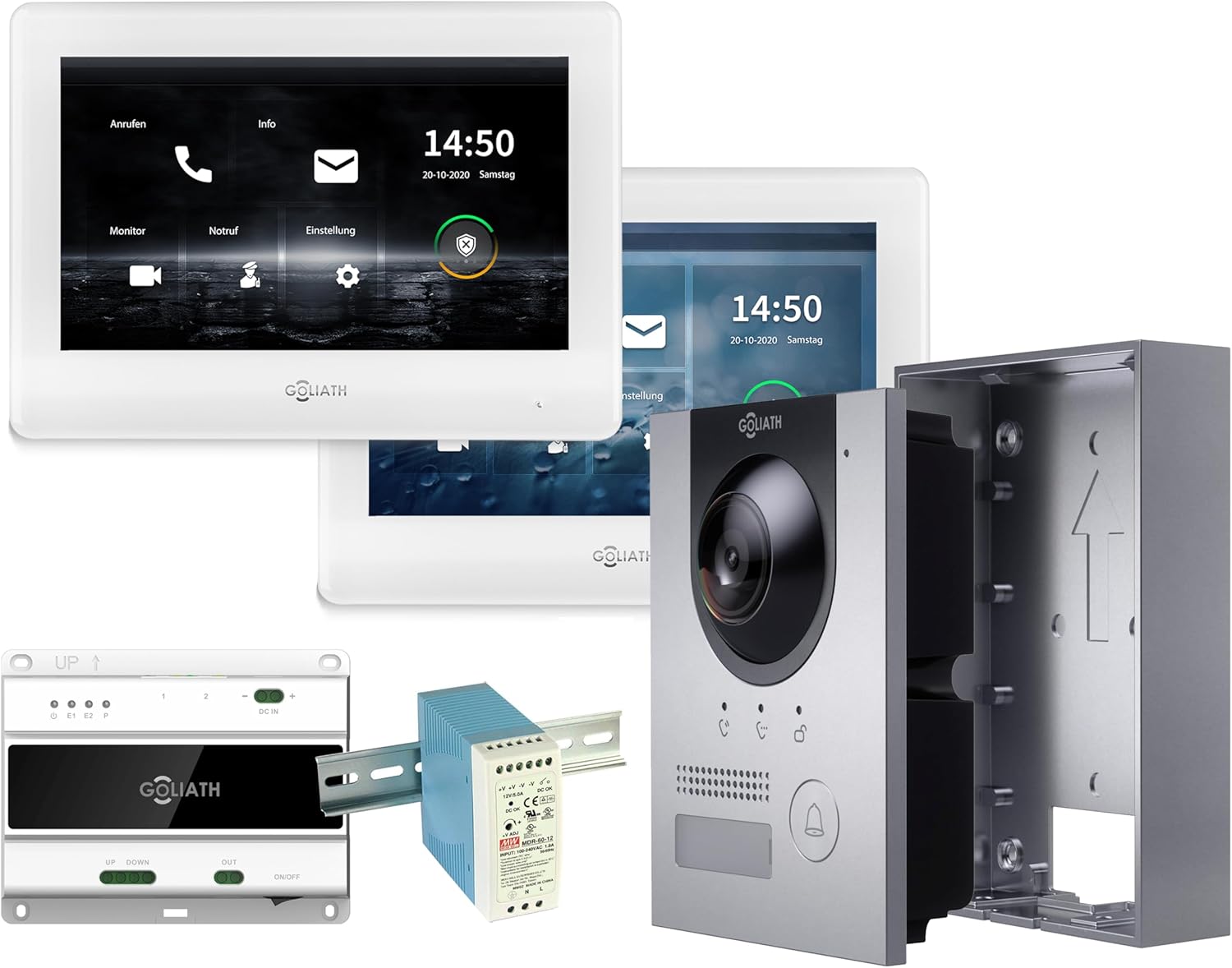 - 🏠 1-Familienhaus-Komplettset: Im Lieferumfang enthalten sind zwei weisse 7-Zoll Touchscreen-Monitor und eine elegante Türstation in Silber mit Aufputzgehäuse sowie ein BUS-Modul und ein Hutschienen-Netzteil für die gesamte Stromversorgung. Dank der