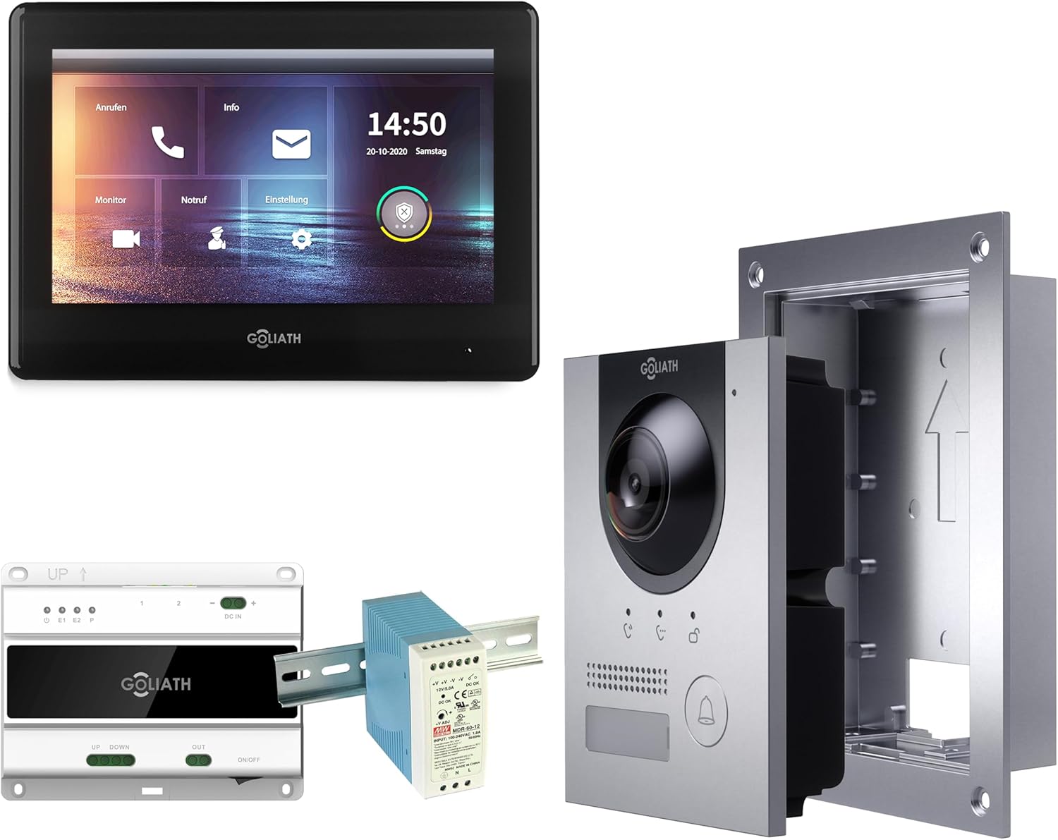 - 🏠 1-Familienhaus-Komplettset: Im Lieferumfang enthalten sind ein schwarzer 7-Zoll Touchscreen-Monitor und eine elegante Türstation in Silber mit Unterputzgehäuse sowie ein BUS-Modul und ein Hutschienen-Netzteil für die gesamte Stromversorgung. Dank