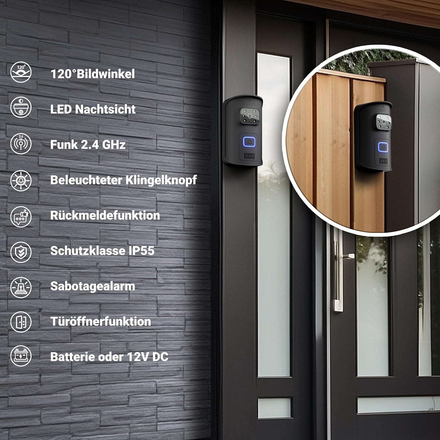 - Bewegungsmelder: Funk-Türsprechanlage, Sabotage-Alarm, regenfeste Aussenstation IP55 zertifiziert, Funk-Sprechanlage mit ca. 20 m Reichweite.
