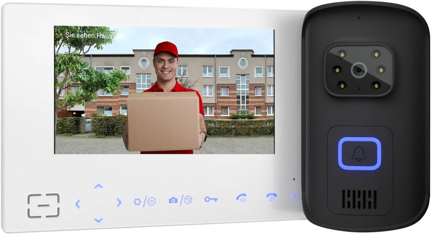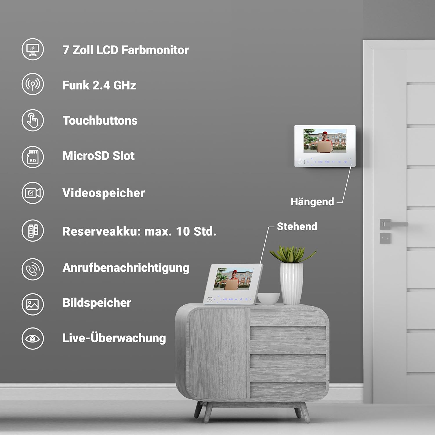 - Wer klingelt denn da? Türsprechanlage mit hochauflösendem 7" Zoll Monitor, Live-Bild von der Kamera, Freisprecheinrichtung, Türöffnerfunktion, Gegensprechanlage, Funk, Speicher erweiterbar auf 32 GB.