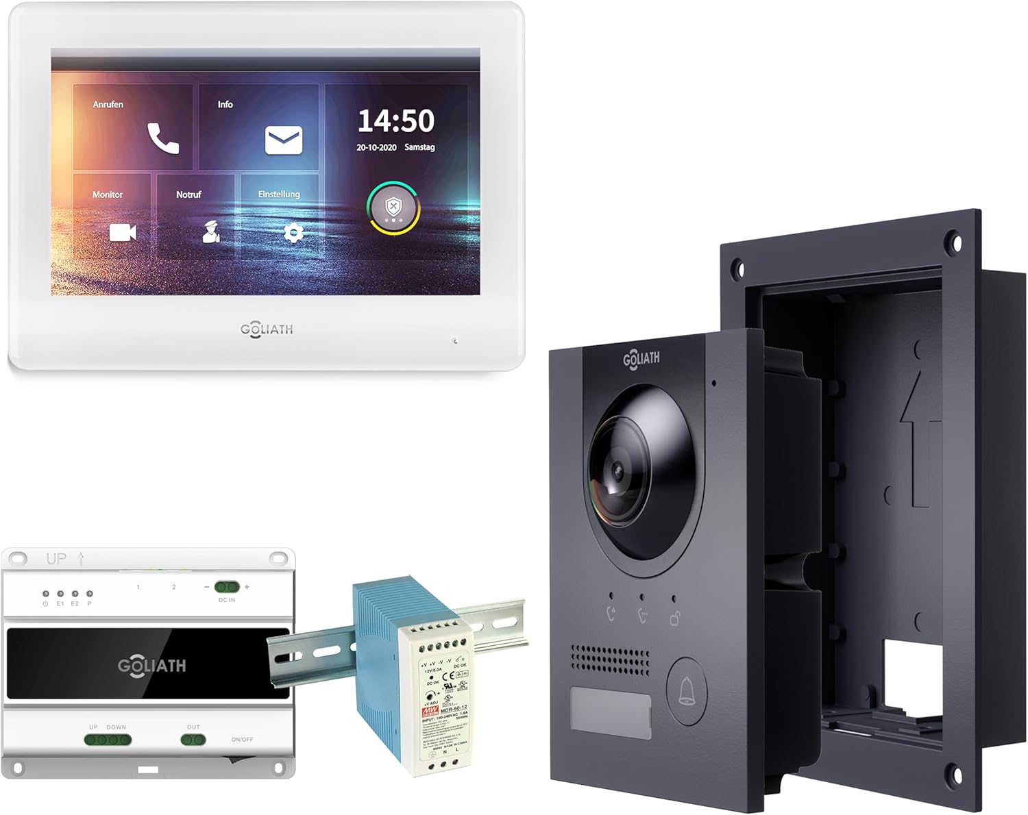 - 2-Draht Bussystem, Türsprechanlage mit Türöffner, Türstation in Anthrazit inkl. Unterputzgehäuse, 7-Zoll Touchscreen Monitor, BUS-Modul und ein Hutschienen-Netzteil für die gesamte Stromversorgung.