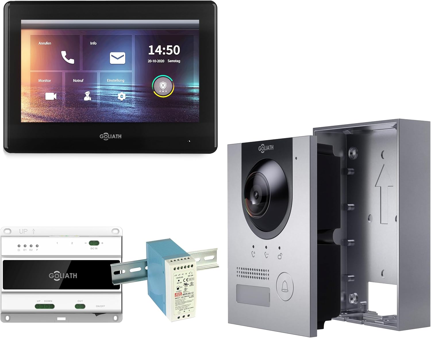 - 🏠 1-Familienhaus-Komplettset: Im Lieferumfang enthalten sind ein schwarzer 7-Zoll Touchscreen-Monitor und eine elegante Türstation in Silber mit Aufputzgehäuse sowie ein BUS-Modul und ein Hutschienen-Netzteil für die gesamte Stromversorgung. Dank