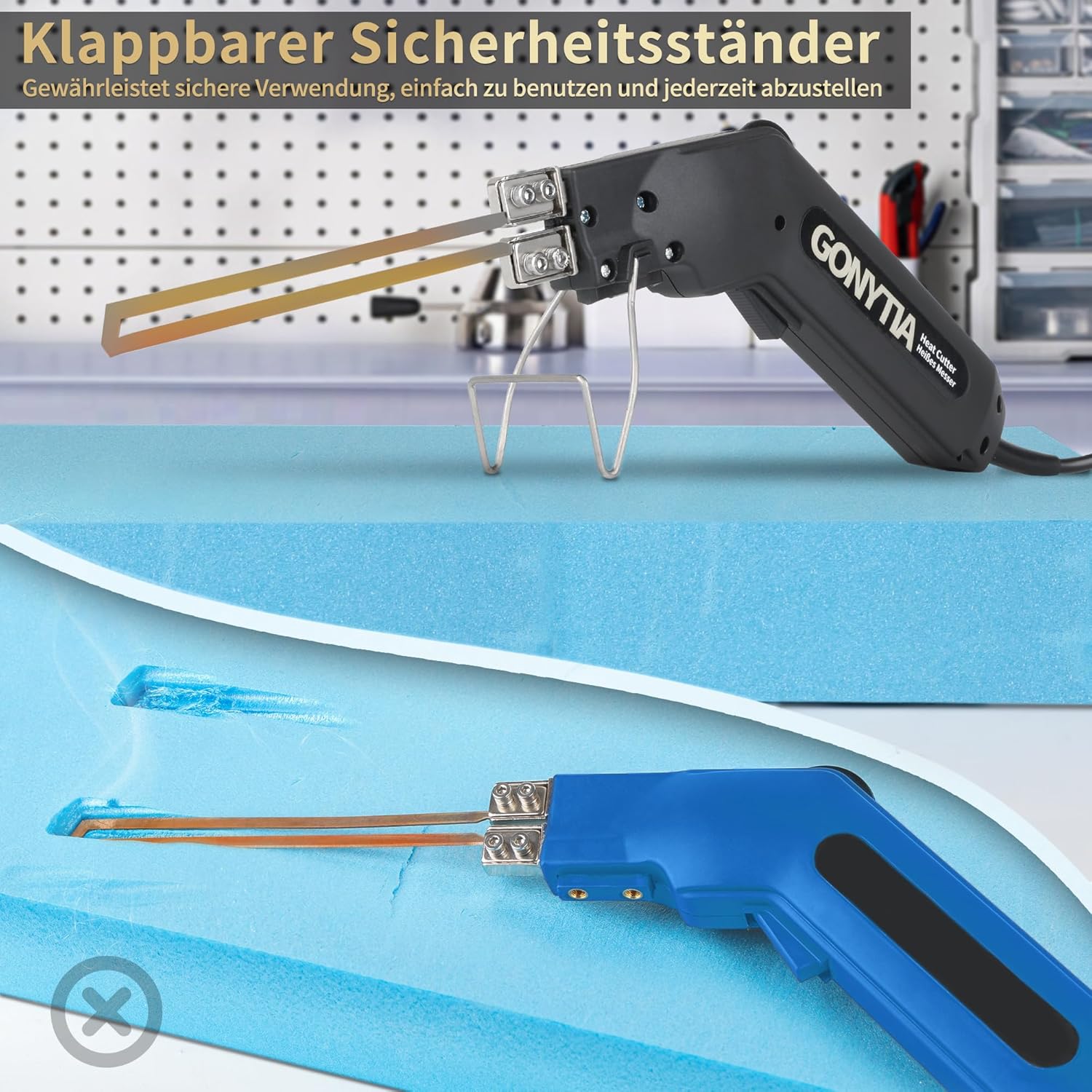 - đăSCHWARZE KLINGEN UND TEMPERATURKONTROLLEăGONYTIA Styroporschneider hat ein brandneues Klingenherstellungsmaterial gewĂ€hlt. Die schwarze Klinge erwĂ€rmt sich schneller und schneidet den Schaum reibungsloser durch. Das GONYTIA Styrocutter kann