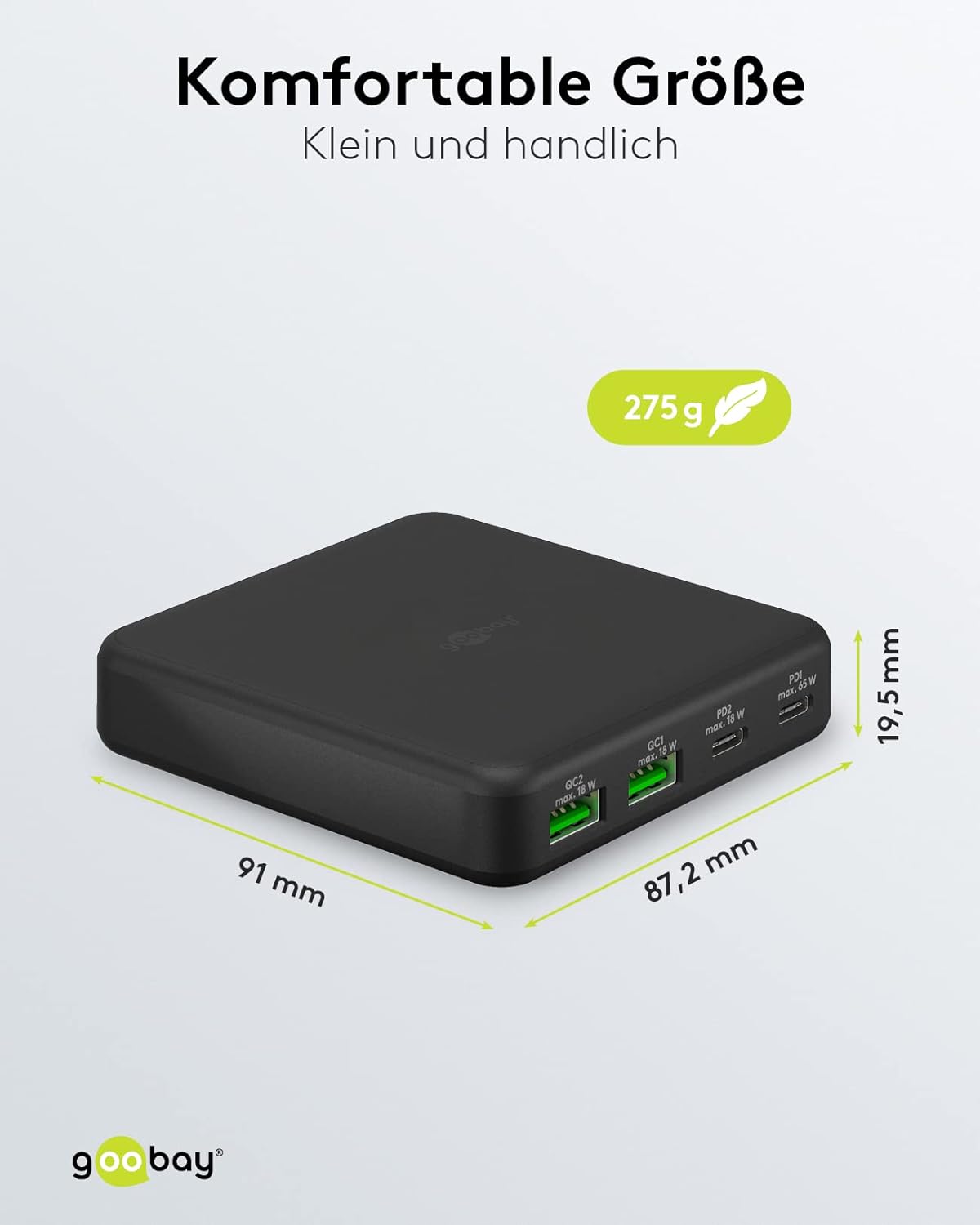 - Multiport 4-fach Ladestation in Schwarz mit 65 W Leistung, ermöglicht eine schnelle Ladung von bis zu 4 Geräten gleichzeitig und überzeugt durch ein Zeitloses Design