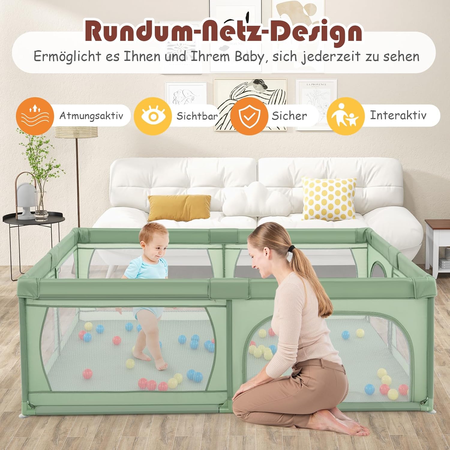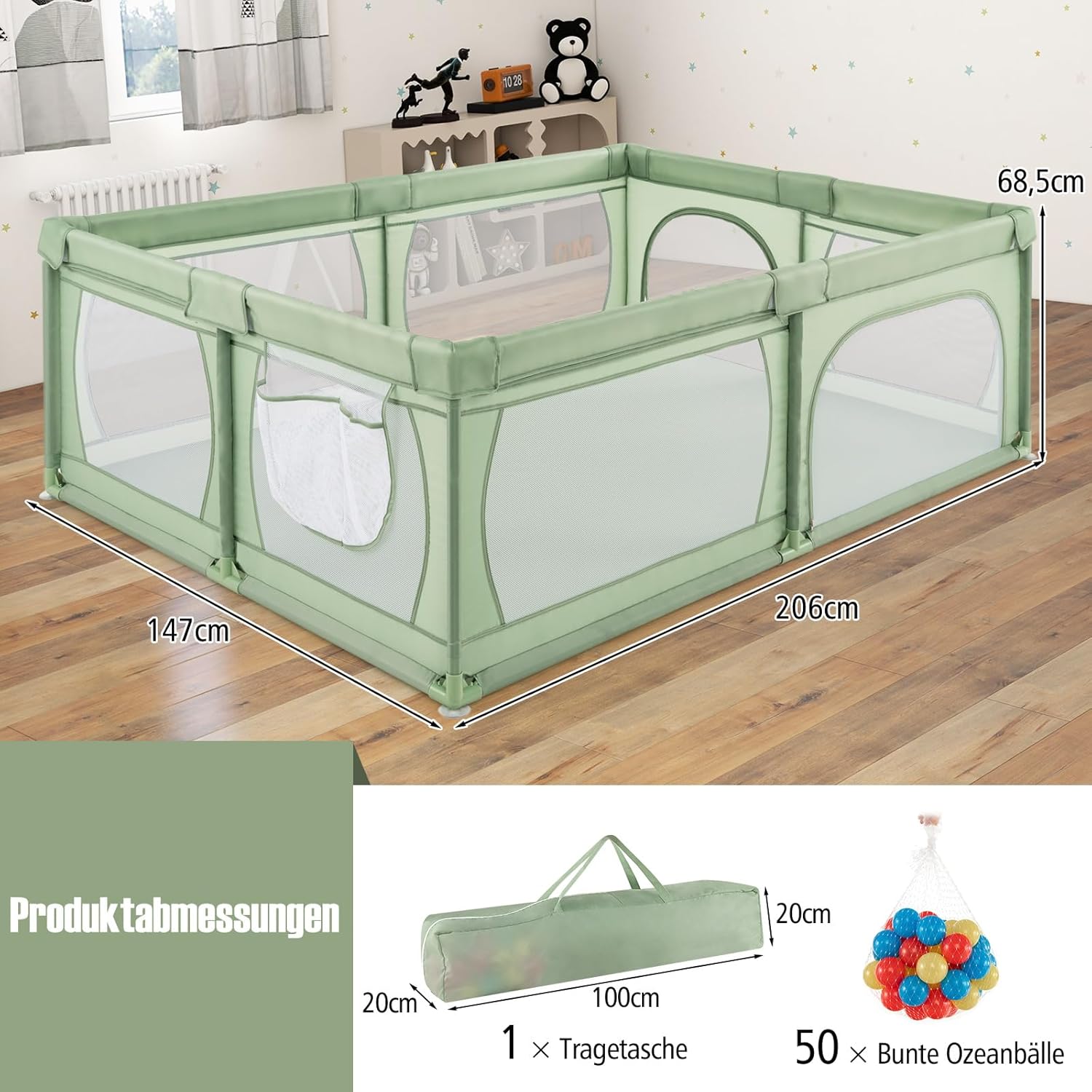 - Grosser Spielplatz: In diesem Laufstall gibt es einen ausreichenden Spielbereich von 200x140cm, damit kann das Baby krabbeln und laufen lernen. Spielen mit 50 ungiftige Spielbällen lässt die Hand- und Augenfähigkeit entwicklen und mehr Spass machen.