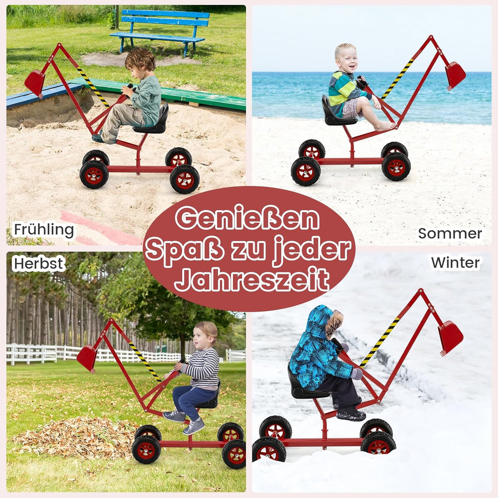 - Gut durchdachte Details: Der Sitz vom Kinderbagger ist mit einer ergonomischen Rückenlehne ausgestattet, die es dem Kind ermöglicht, bequem zu sitzen, ohne herunterzufallen. Zudem ist der Rahmen aus massivem Metall mit Schutzlack überzogen, sodass Sie