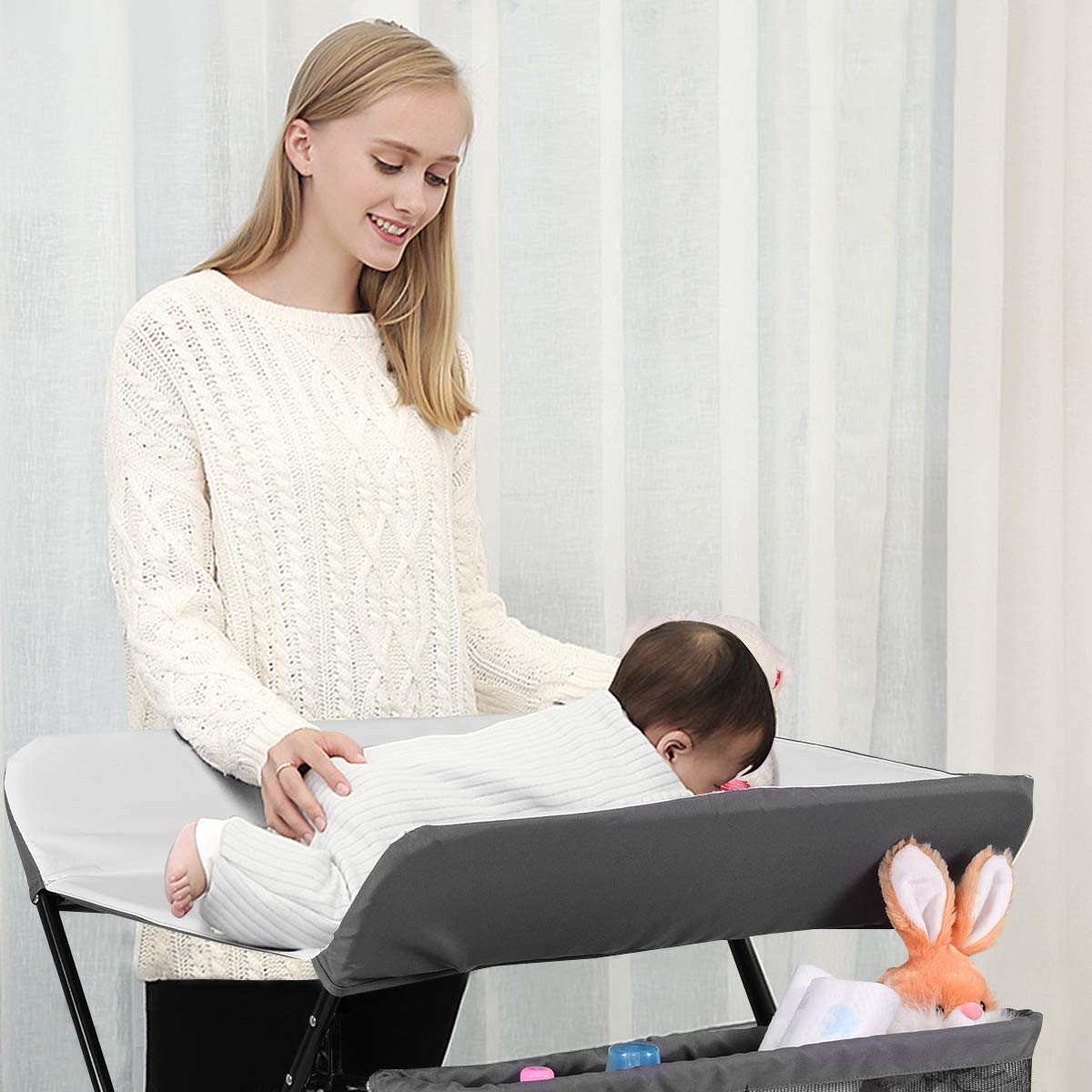 - 👶🏻Sicher und Kinderfreundlich: Die untere Stütze des Wickeltischesist aus Eisenrohr, der fest und stabil ist. Der Babykorb ist U-förmig gestaltet, um ein Herunterrollen des Babys zu verhindern und die Sicherheit zu gewährleisten. Seine