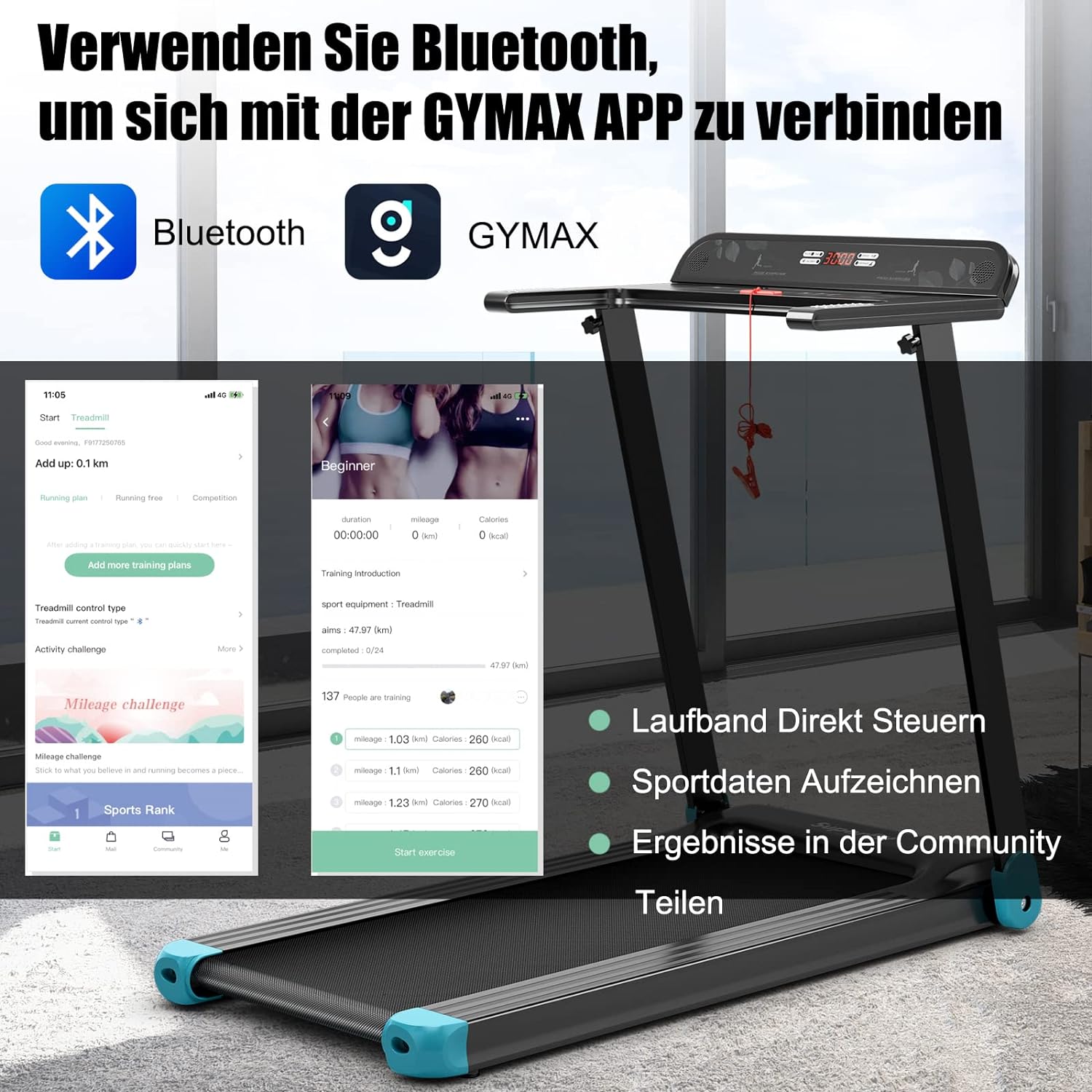 - Bluetooth-Verbindung: Sie können das elektrische Laufband über Bluetooth mit „EsangAudio“ verbinden. Die Musik wird dann über die hochwertigen Bluetooth-Lautsprecher abgespielt. Ausserdem kann das Laufband über die GYMAX App gesteuert werden, es