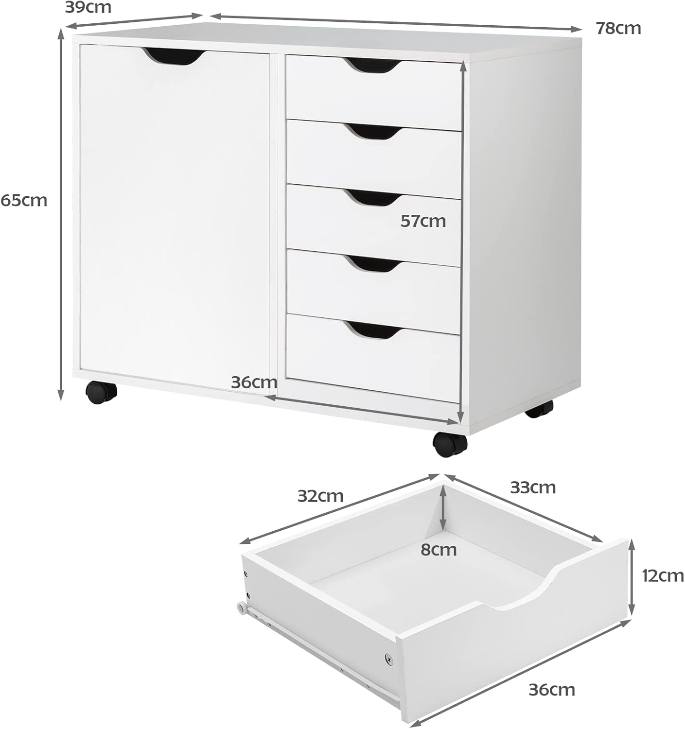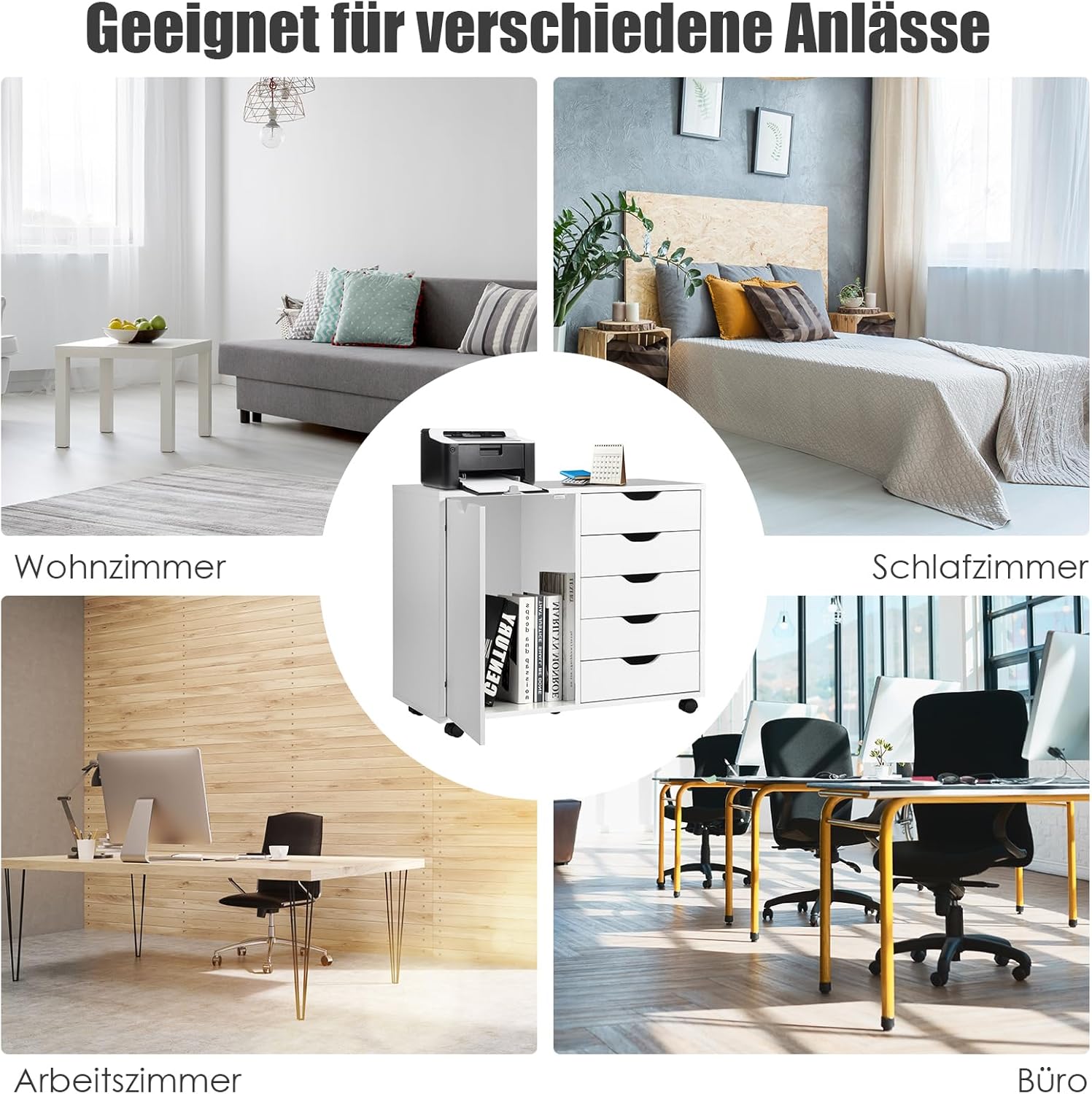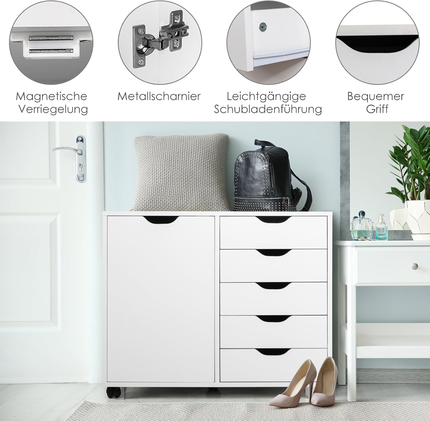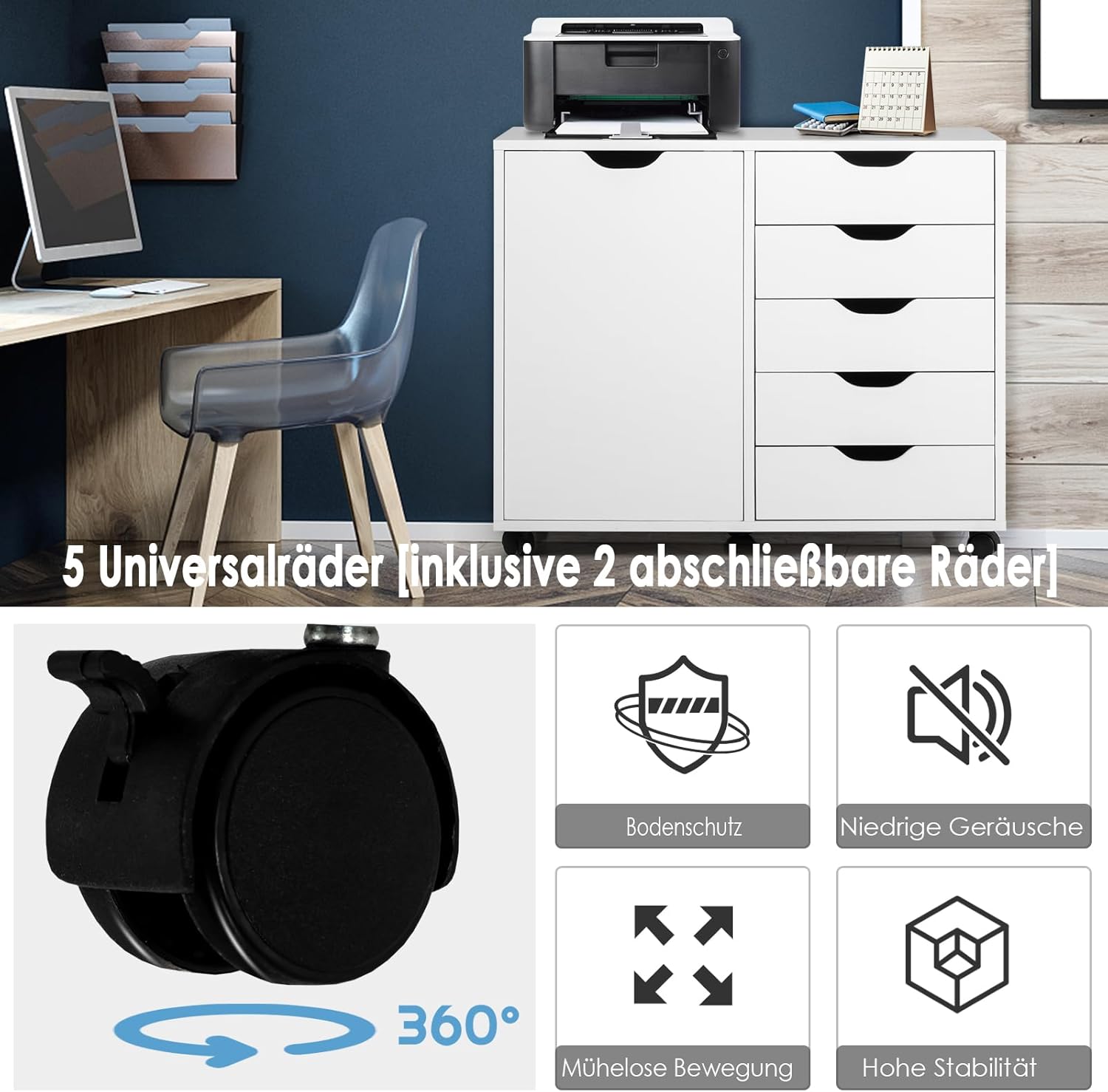 - 5 Rollen: Fünf Räder helfen Ihnen, den Büroschrank in jede gewünschte Position zu bewegen, und 2 feststellbare Räder helfen, ihn jederzeit anzuhalten.