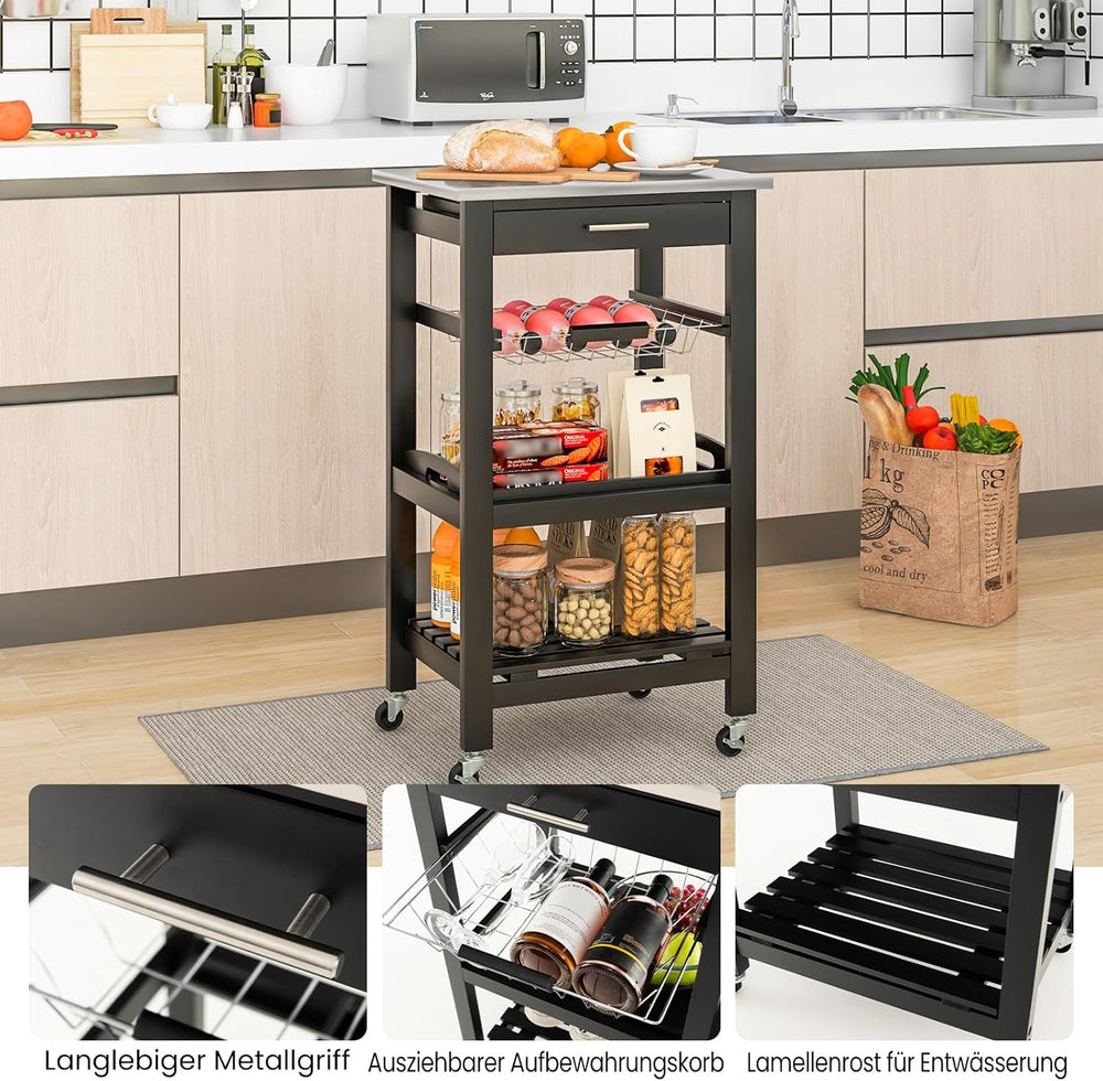 - Edelstahlplatte: Im Gegensatz zu herkömmlichen Küchenwagen mit Holzplatten verfügt dieser über eine robuste, kratzfeste und leicht zu reinigende Edelstahl-Arbeitsplatte. Sie bietet eine zusätzliche Fläche zum Zubereiten und Servieren von Speisen.