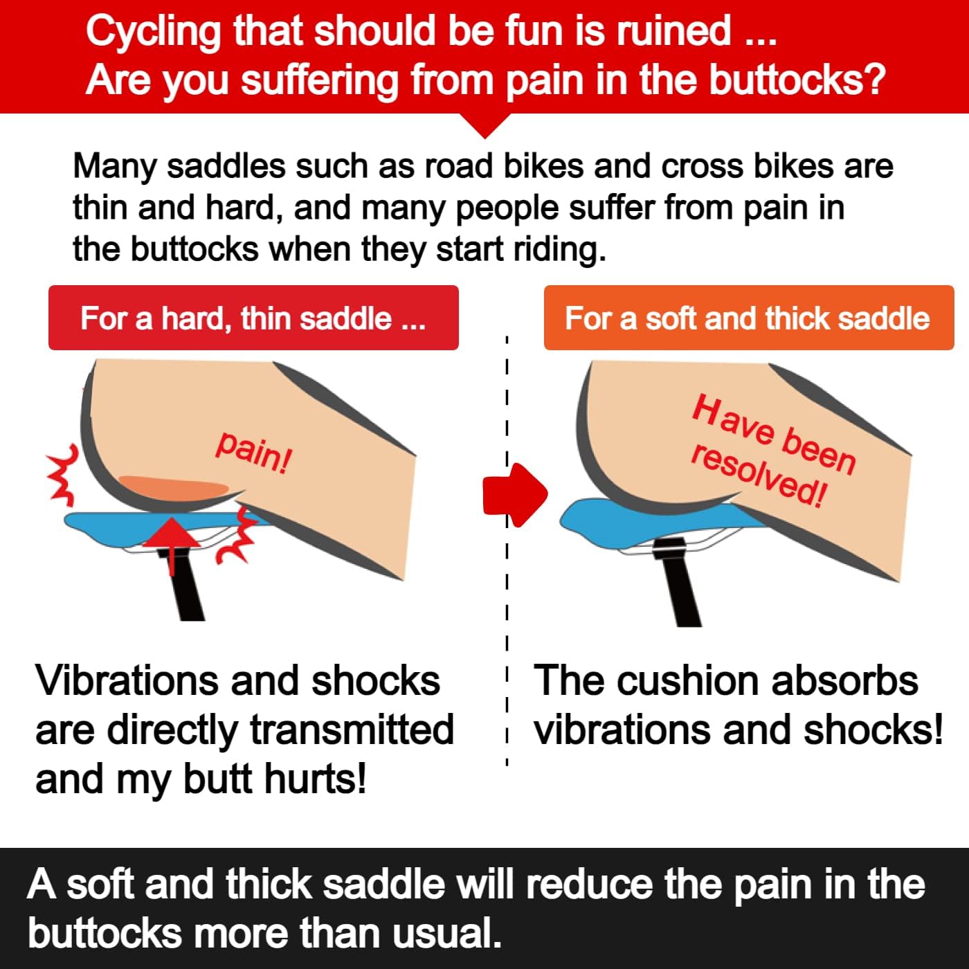 - Absorbiert Stösse vom Boden: Schaumstoff und weicher Sattel für langes Radfahren. Die Rückseite ist rund geformt. Weiches und dickes Polstermaterial reduziert Schmerzen im Gesäss.