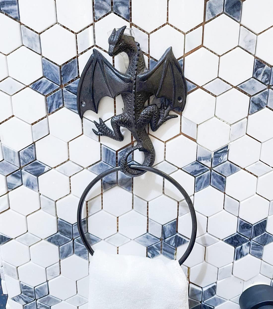 - Mythisches gotisches Drachen-Design. Dieses 2-teilige Badezimmer-Zubehör-Set enthält 1 Handtuchring aus Eisen und 1 Toilettenpapierhalter. Das einzigartige Drachen-Design macht sie zu einem tollen gotischen oder mythischen Dekor für Ihr Badezimmer.