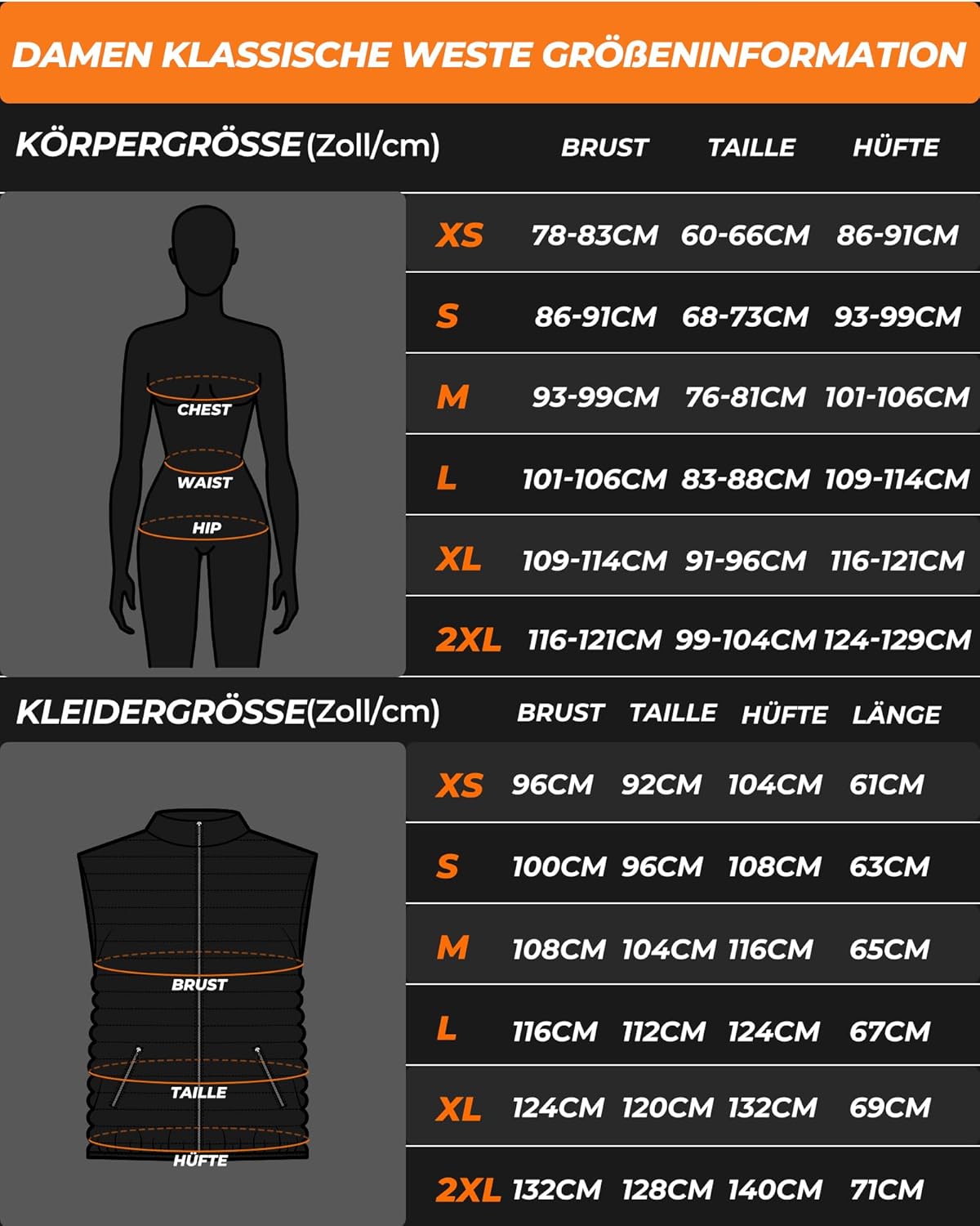 - HALTEN SIE IHREN KÖRPER WARM: Unsere beheizbare weste damen verfügt über 9 Heizzonen, die den Kragen, den Rücken, die Taille, die Schultern und den Bauch abdecken und ergonomisch für die Wärmeentwicklung gestaltet sind. Die Heizzonen sind in 3