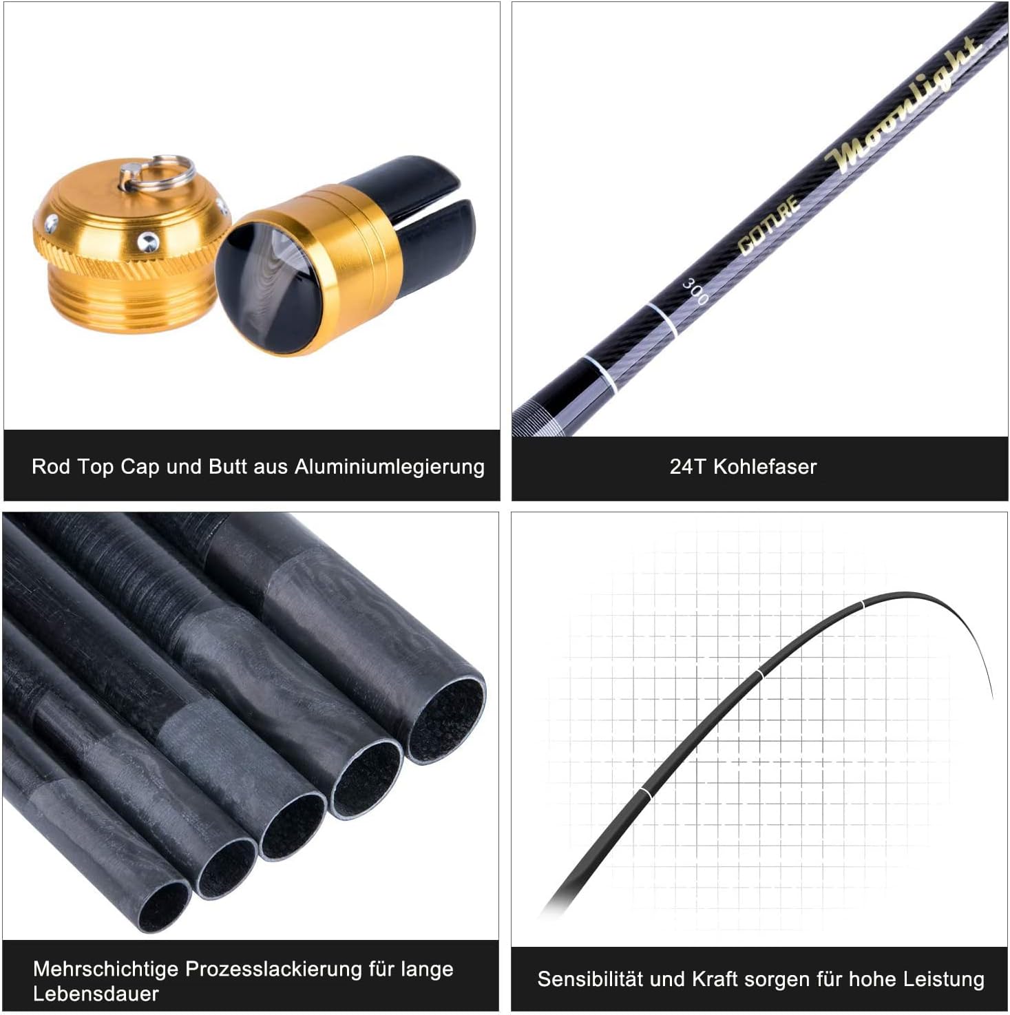 - 【 Material 】 Moonlight Series Angelrute ist aus hochwertigem Carbon Fiber hergestellt. Die Angelrute der Schwanz Stecker sind Aluminium-Legierung verwenden, langlebig und nicht leicht zu beschädigen