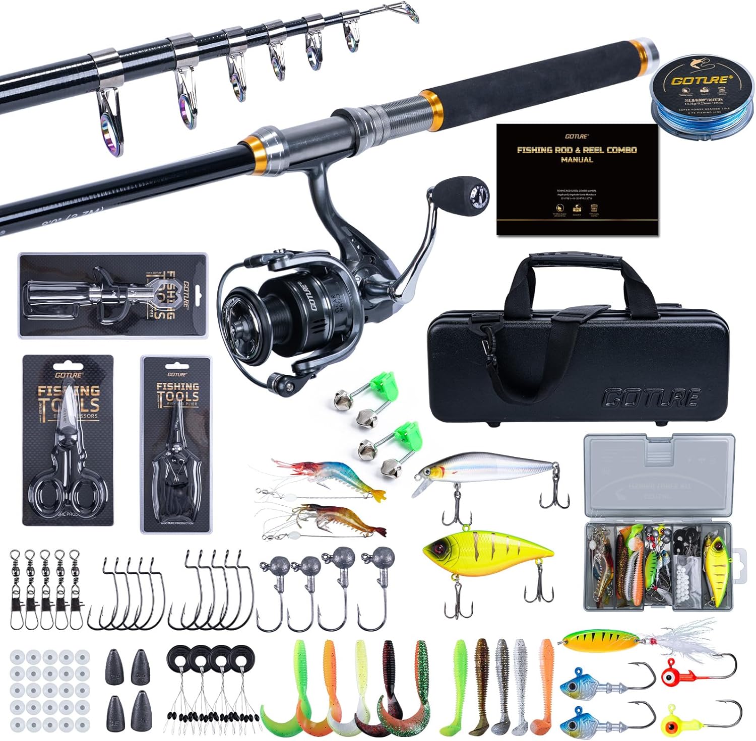 - Angelset mit Tragetasche: Dieses vielseitige Angelset enthält alles, was Sie für ein erfolgreiches Angelerlebnis benötigen. Es enthält eine Teleskop-Angelrute, eine Stationärrolle, eine 150 m lange (14 kg) Angelschnur, zwei Bissanzeiger, Schere für