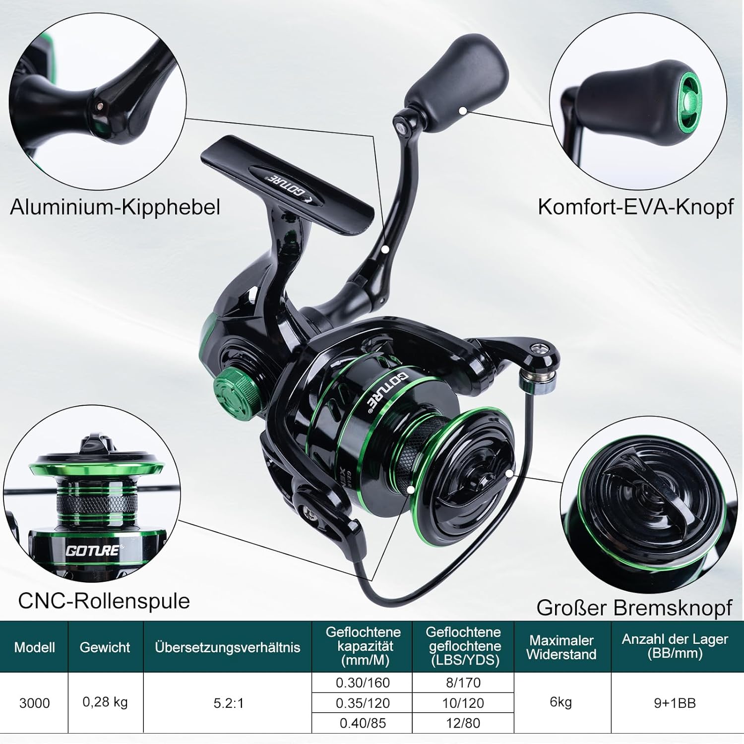 - Doppelte leistungsstarke Rolle mit leichtgängigen 9+1 Kugellagern: Die Angelrolle verfügt über eine CNC-gefräste Aluminium-Hohlspule, einen vergrösserten Bremsknopf für schnelle Anpassungen und einen Ein-Knopf-Rücklaufsperrschalter für präzise