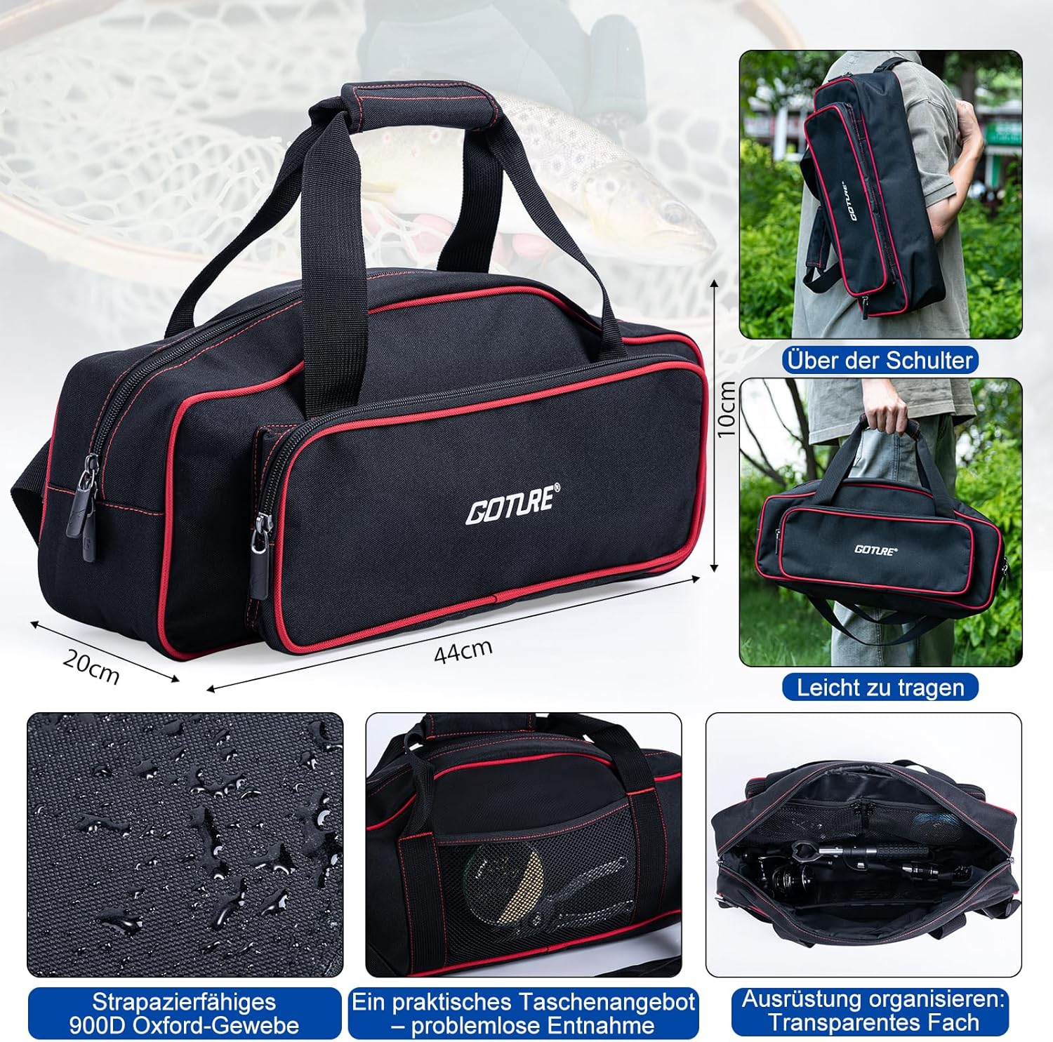 - Inklusive 900D-Tragetasche: Die mitgelieferte Angeltasche aus spritzwasser- und abriebfestem 900D-Oxford-Gewebe ist praktisch und kann in der Hand oder über der Schulter getragen werden. Gepolsterte Griffe und verstellbare Gurte sorgen für hohen