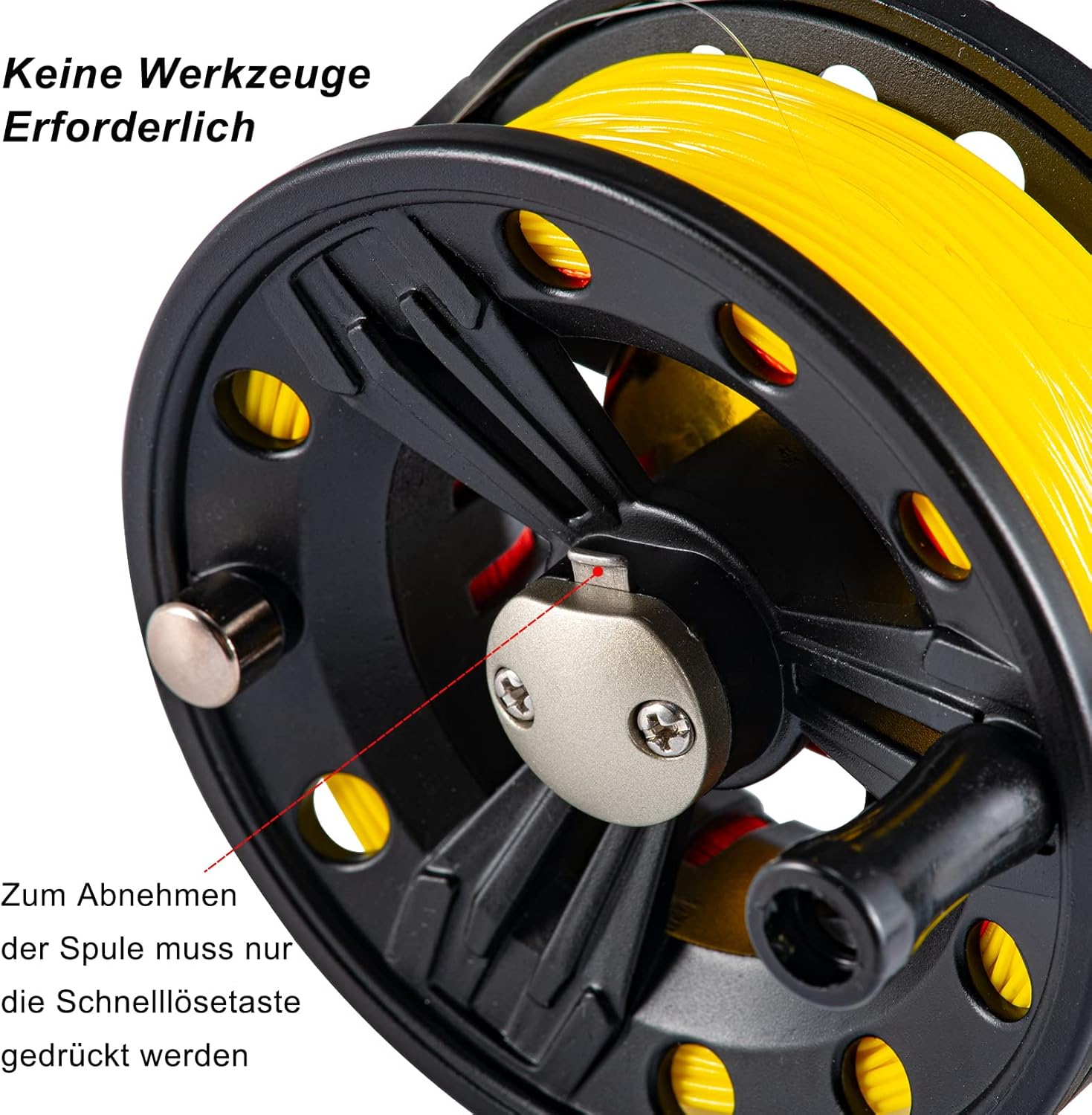 - 【Vorgeladene Schnur】 Die Angelrolle ist mit Fliegenschnur, Backing-Schnur und konischem Vorfach vorgespult. Die linke oder rechte Hand ist für individuelle Bedürfnisse austauschbar.