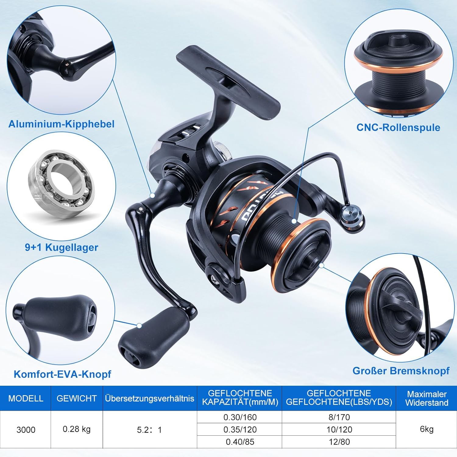 - 【HOCHWERTIGE ROLLE & REIBUNGSLOSE PERFORMANCE】Robuste Graphit-Rolle mit 9+1 Edelstahl-Kugellagern an entscheidenden Stellen und Aluminium-Spule für extreme Langlebigkeit, Leichtigkeit und butterweiches Werfen & Kurbeln. Inkl. klarer Nylonschnur