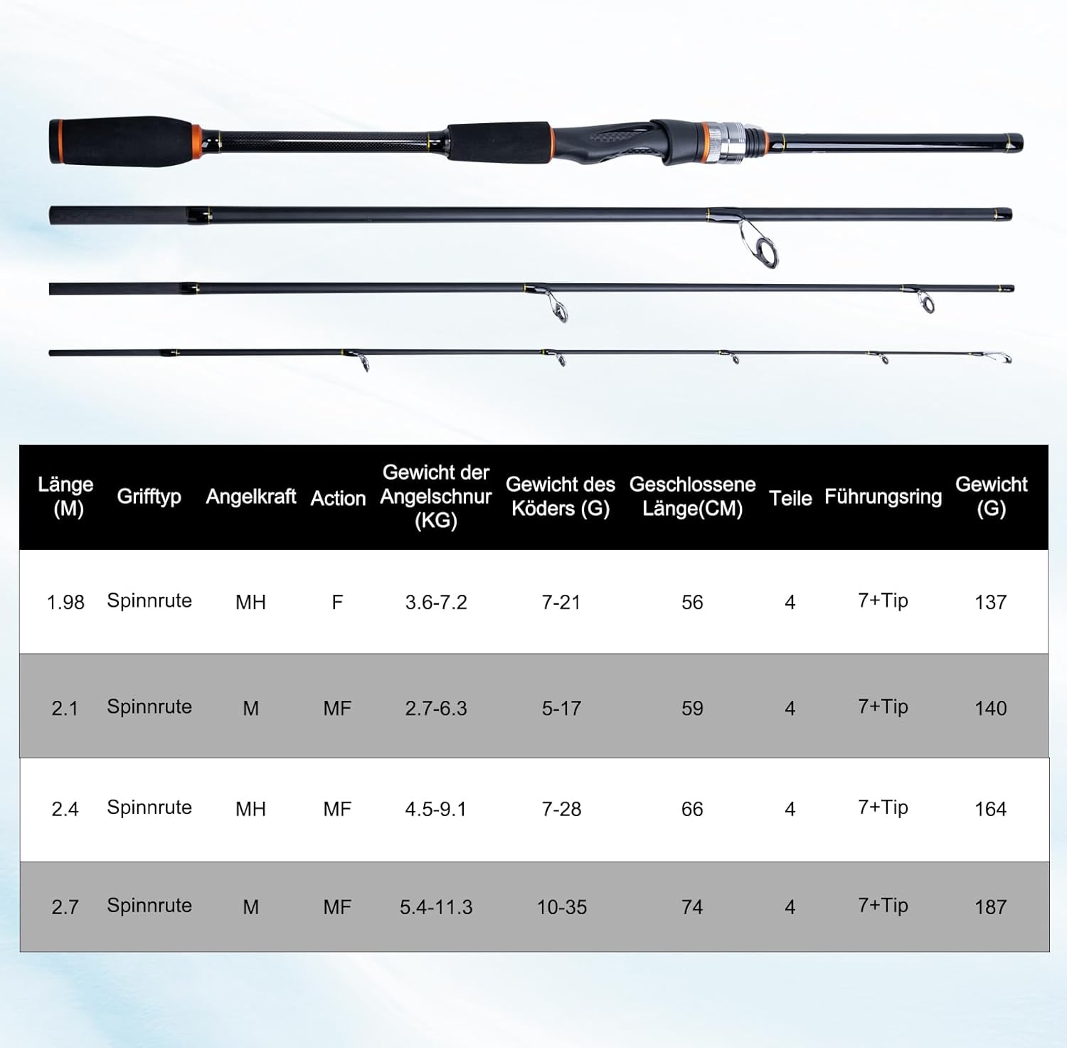 - 【PREMIUM MATERIAL & DESIGN】Hochwertige 24T Hochmodul-Kohlefaser-Rute mit rostfreien Keramikführungsringen für minimale Reibung, maximale Wurfweite und extrem sensibles Bissgefühl. Leichtbau-Design für hervorragende Balance und Handhabung.