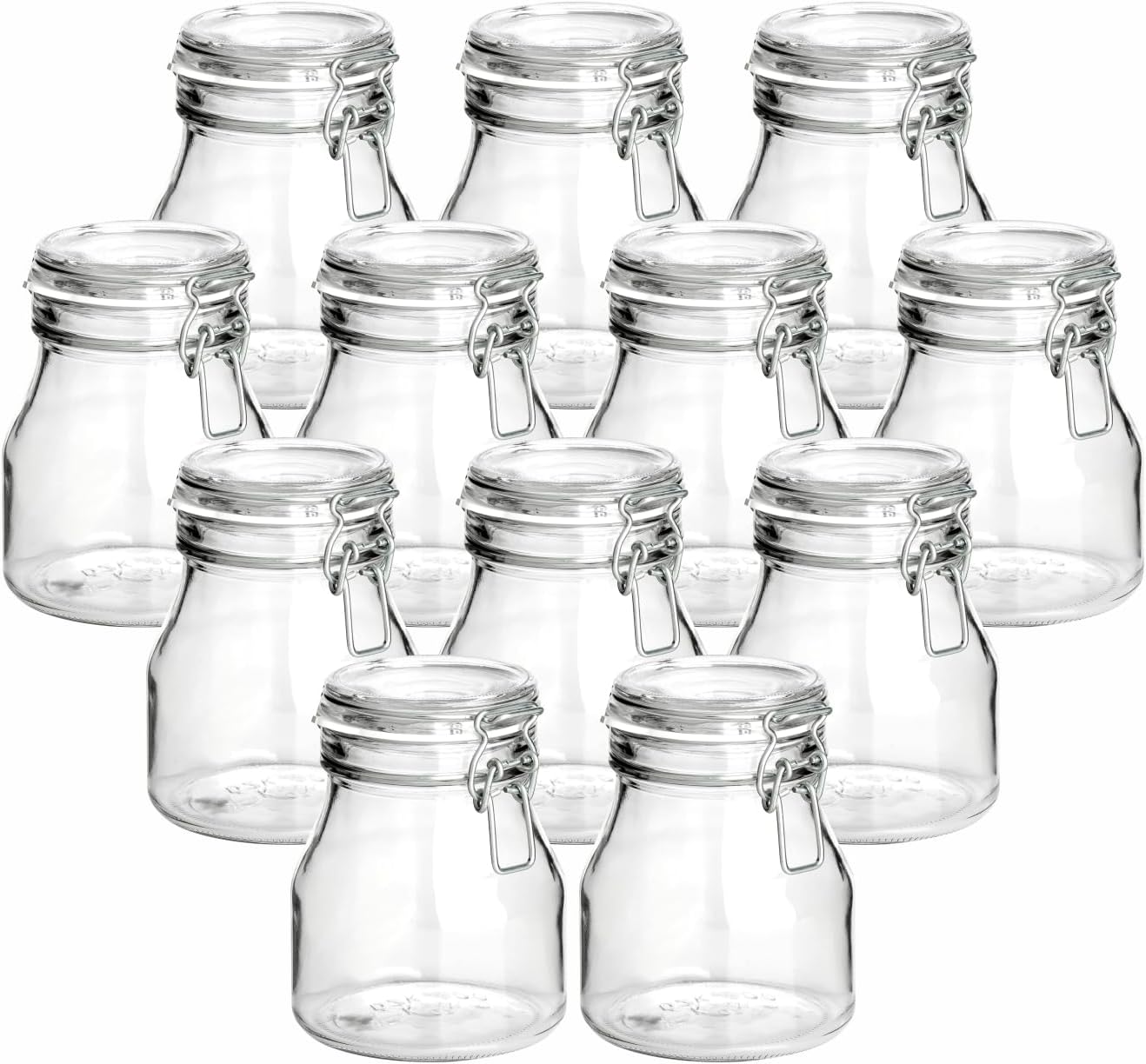 - LIEFERUMFANG: 12x Einmachglas mit Bügelverschluss // Masse (ØxH): ca. 10,9 x 14,1 cm // Glas-Öffnung (Ø): ca. 7,3 cm // Nennvolumen: ca. 750 ml // Gewicht: ca. 544 g // Material: Glas, Metall, Gummi // Farbe Gummi: weiss