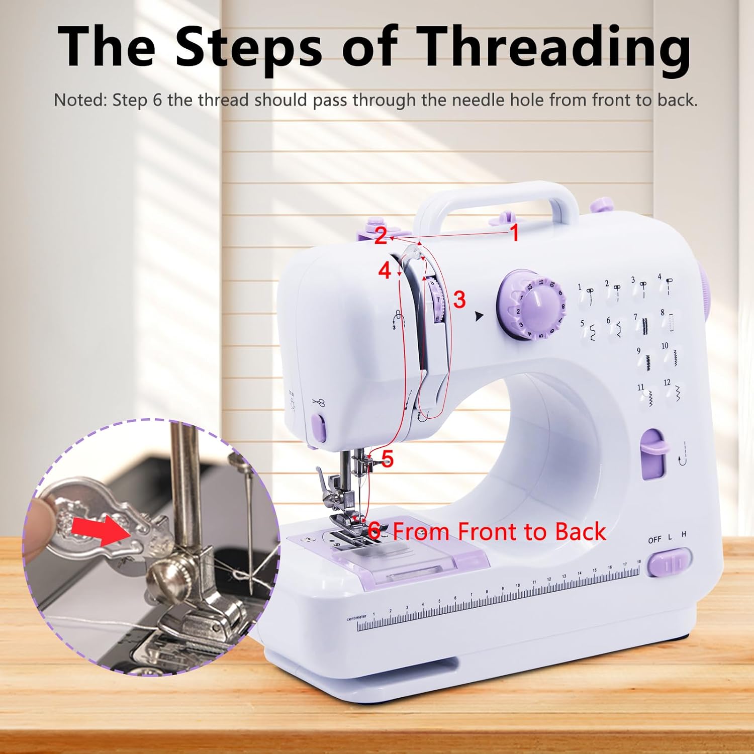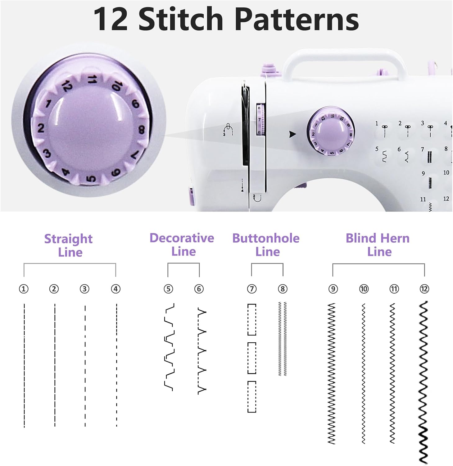 - ➤【12 Nähmuster】Diese Nähmaschine für Anfänger verfügt über eine Rückwärtsnähfunktion und 12 integrierte Stiche, darunter Geradstich, Knopflochstich, Zierstich und Blindstich. Ein integrierter Fadenabschneider und eine Beleuchtung