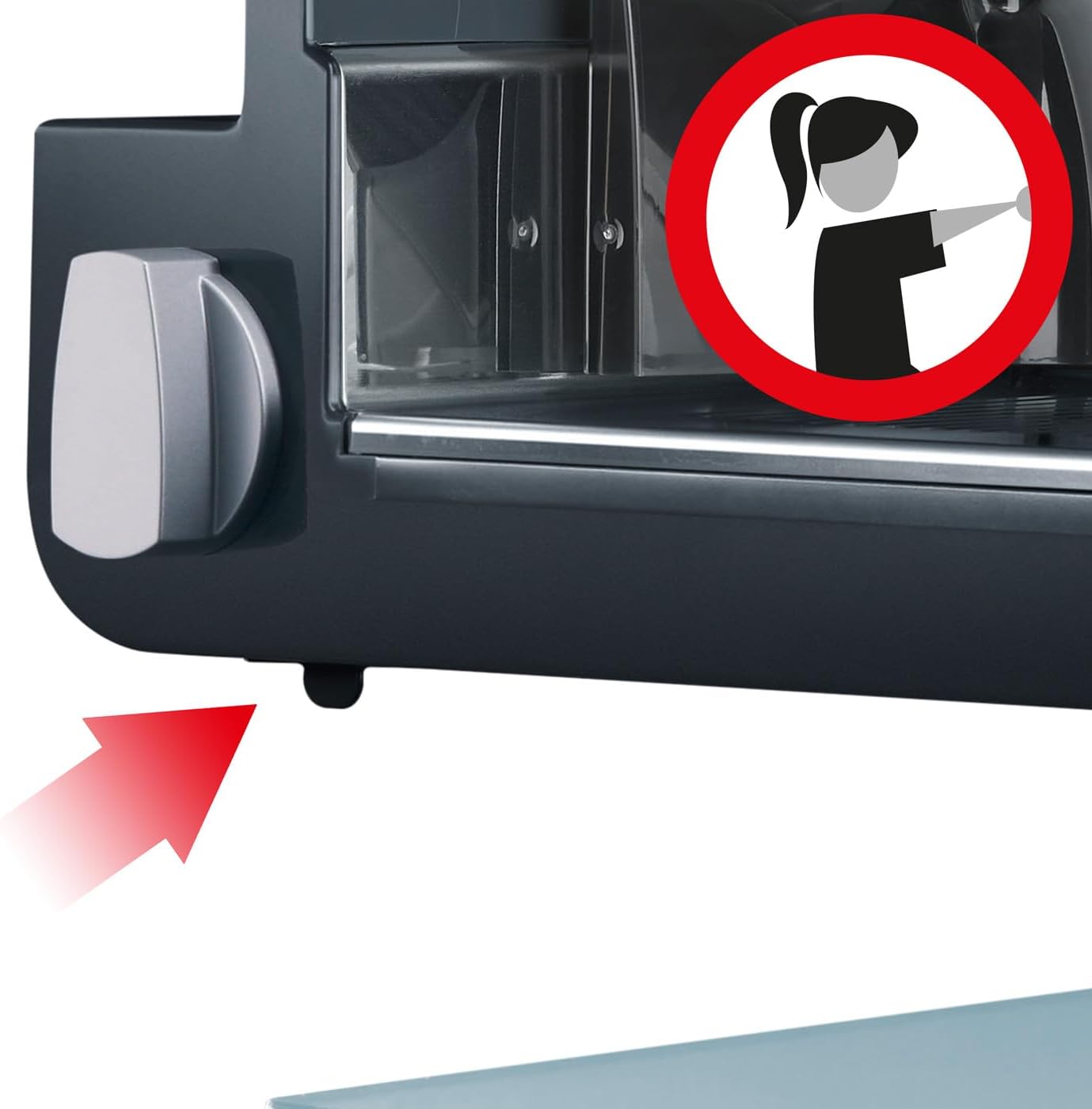 • Das hochwertige Vollstahlmesser in Gewerbequalität ist durch die abnehmbare Messerabdeckplatte aus Edelstahl geschützt und unterstützt durch den Hohlschliff das Schneiden von hauchdünnen Scheiben - für ein jederzeit perfektes Schneidergebnis.