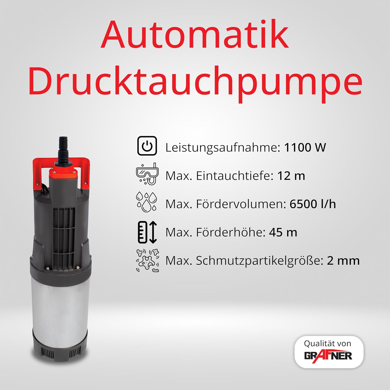 - DETAILS: Leistung: 1100 Watt | Autostart und Autostopp | Rückschlagventil | Fördermenge: Bis zu 6500 l/h | max. Druck: 4,5 bar | max. Förderhöhe: 45 Meter | max. Eintauchtiefe: 12 Meter | max. Fremdkörpergrösse: 2 mm | incl. mehrdimensionalem