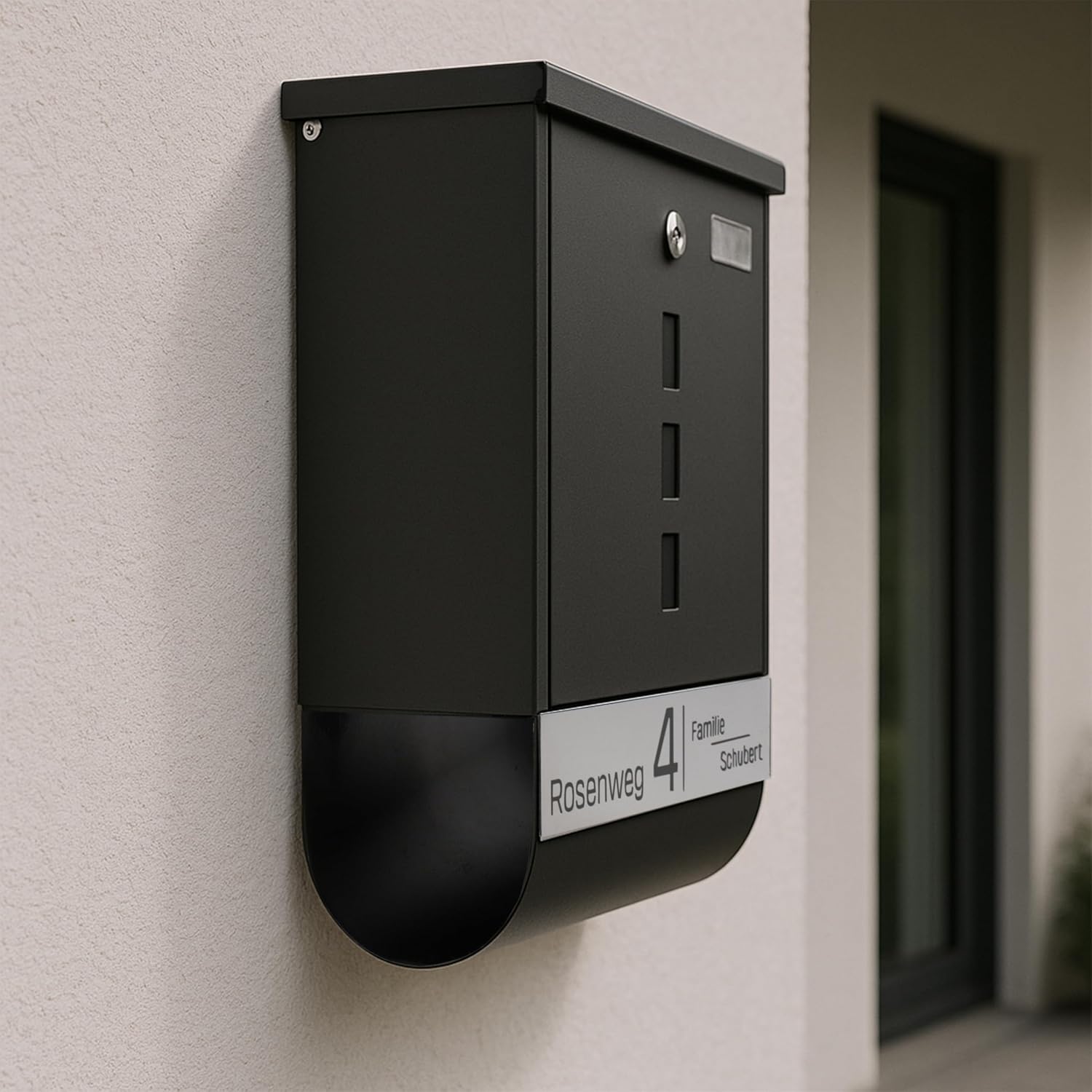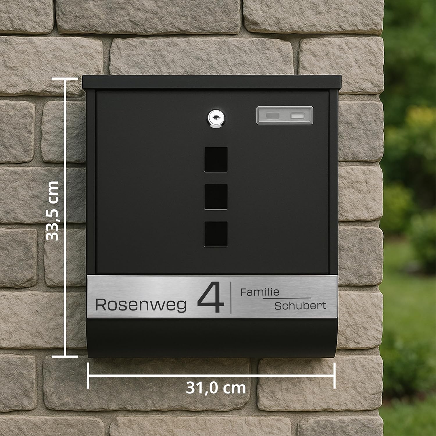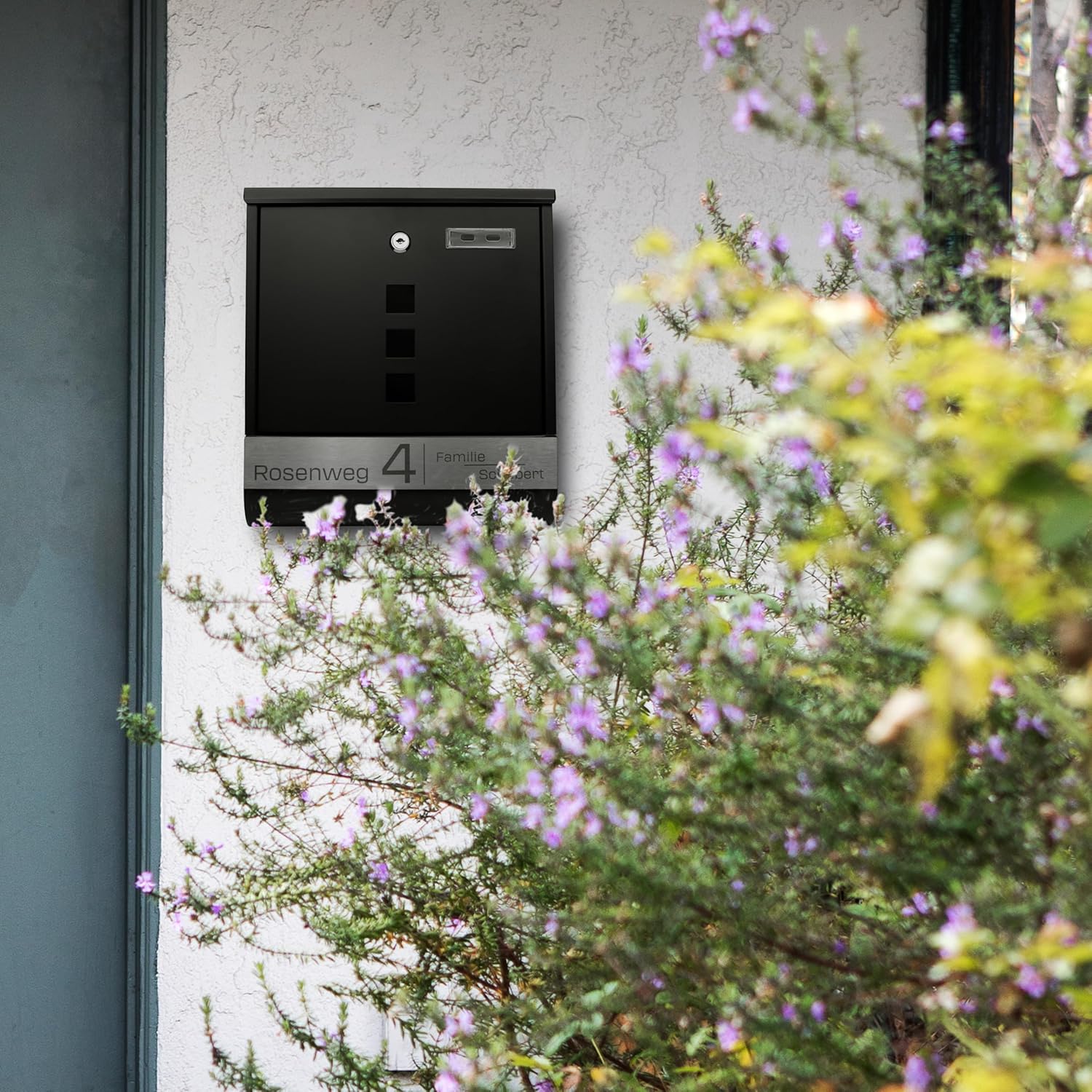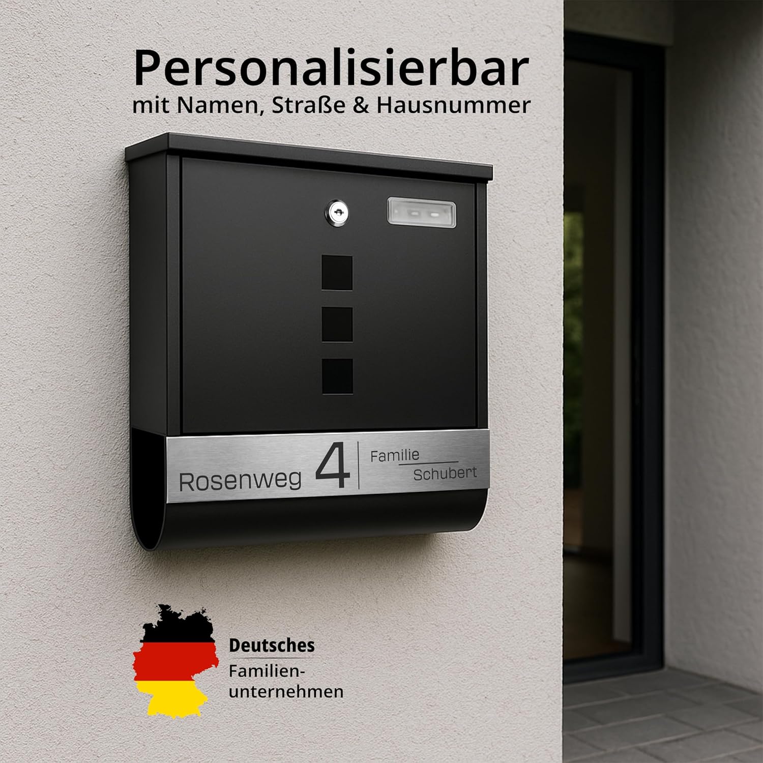 - PERSONALISIERT: Unser moderner Wandbriefkasten kann mit wenigen Klicks ganz und individuell mit Ihrem Namen, Ihrer Strasse und der Hausnummer personalisiert werden. Die langlebige und elegante Gravur auf dem V2A-Edelstahlschild ist aus der Ferne gut