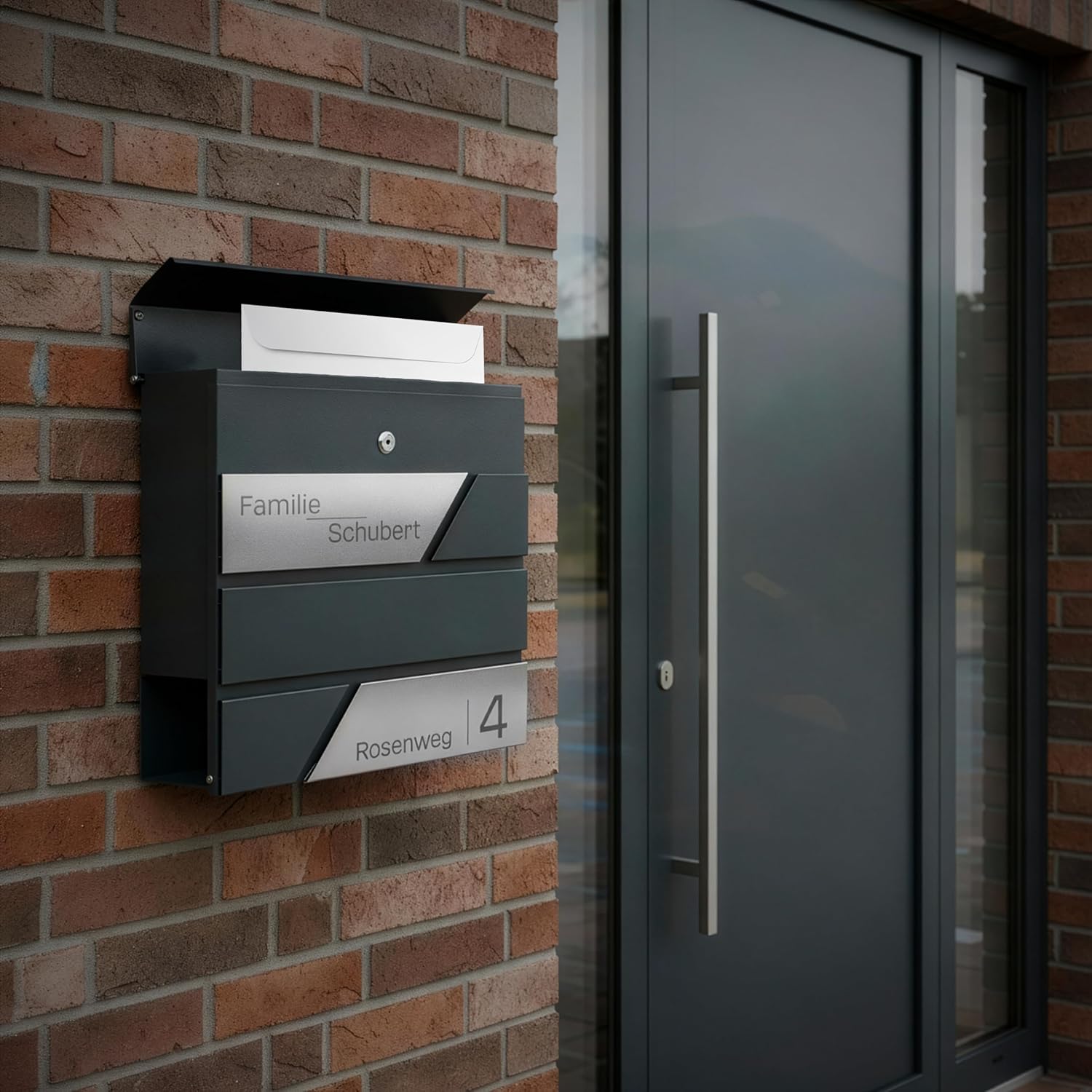 - PERSONALISIERT: Unser moderner Wandbriefkasten kann mit wenigen Klicks ganz und individuell mit Ihrem Namen, Ihrer Strasse und der Hausnummer personalisiert werden. Die langlebige und elegante Gravur auf Edelstahl ist aus der Ferne gut lesbar und macht
