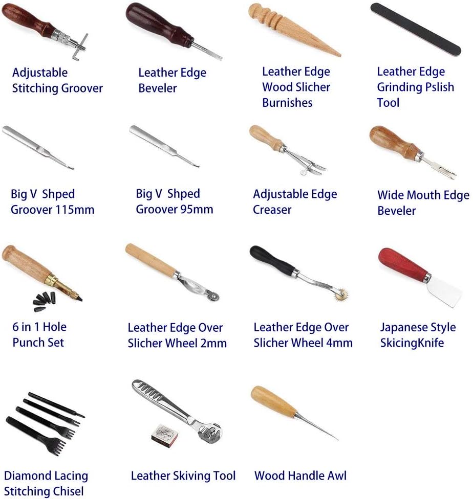 • 【Lederbearbeitungswerkzeug-Kit】 Diese Lederhandwerkswerkzeuge enthalten Stanzen, Nähen, Schnitzen, Dekorieren, Kleben, Kantenschleifen und andere Funktionen für Lederhandwerk.