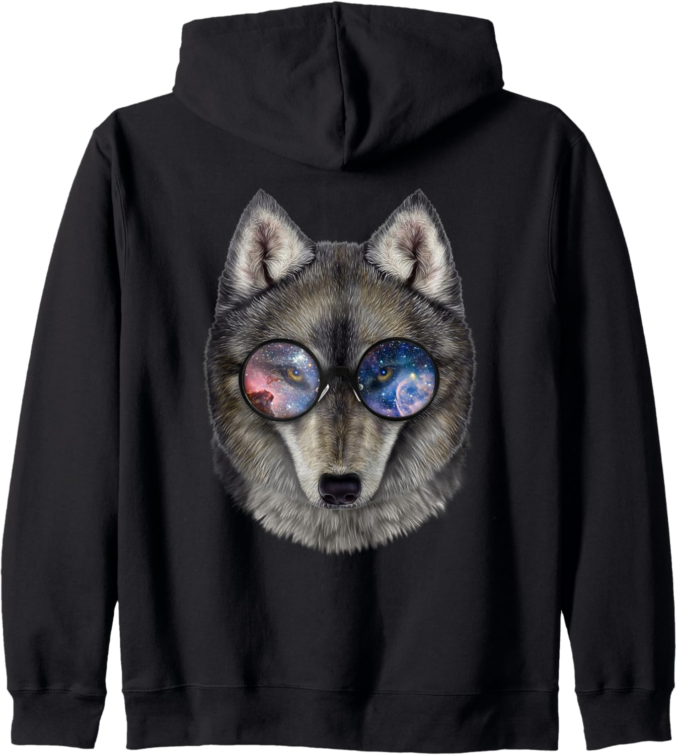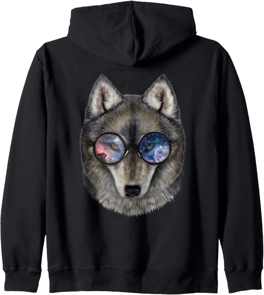 Grauer Wolf, die Raumgalaxiensonnenbrille trägt Kapuzenjacke