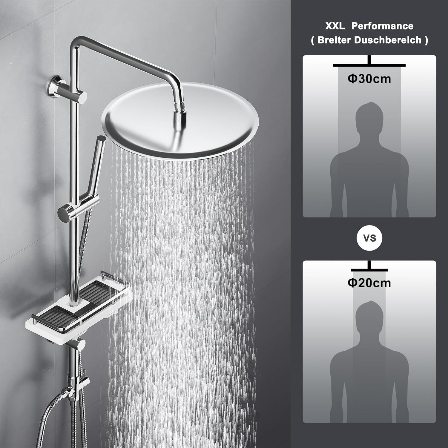 - 【XXL-Regenduschkopf】Spiegeleffekte Kopfbrause D30cm aus Edelstahl mit pflegeleichten anti-kalk Düsen. HANDBRAUSE aus Kunststoff, single Funktion, einfache Handhabung.【XXL-Duschablage】 kein Werkzeug erforderlich und kein Loch an der Wand.