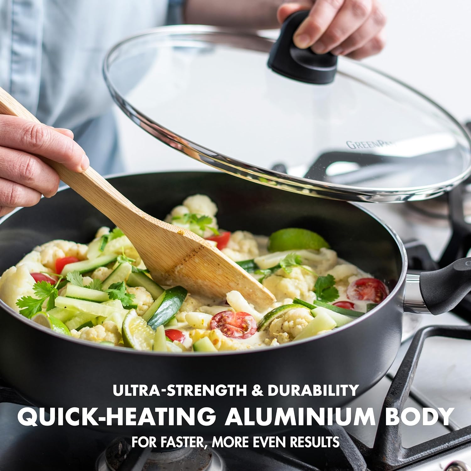 • Langlebiger Glasdeckel zur einfachen Überwachung der Speisen