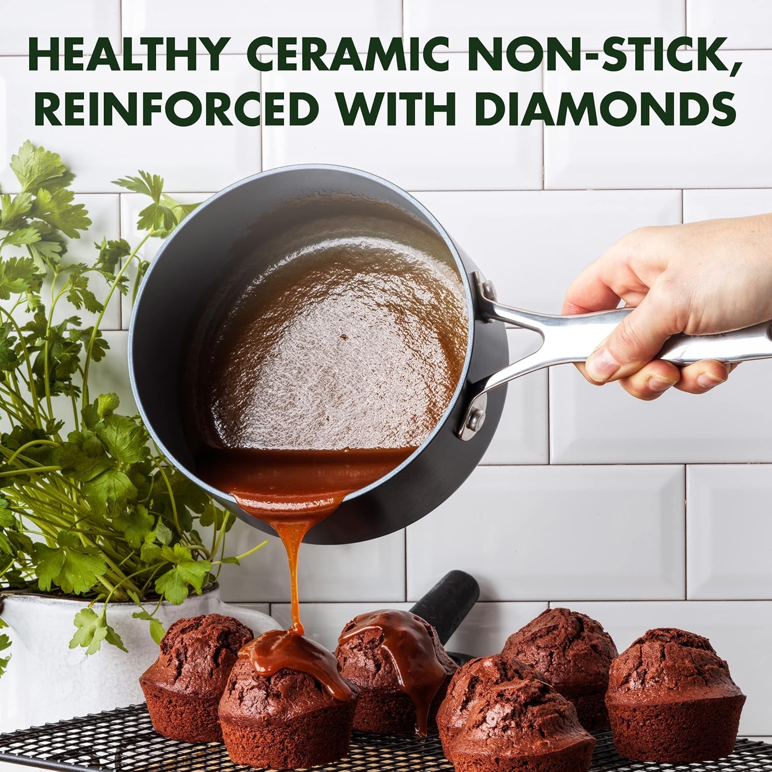 - Unsere diamantbesetzte Antihaftbeschichtung ist unempfindlich gegenüber Metallgeschirr und bietet eine bemerkenswerte Haltbarkeit, eine gleichmässige Erhitzung und eine mühelose Reinigung