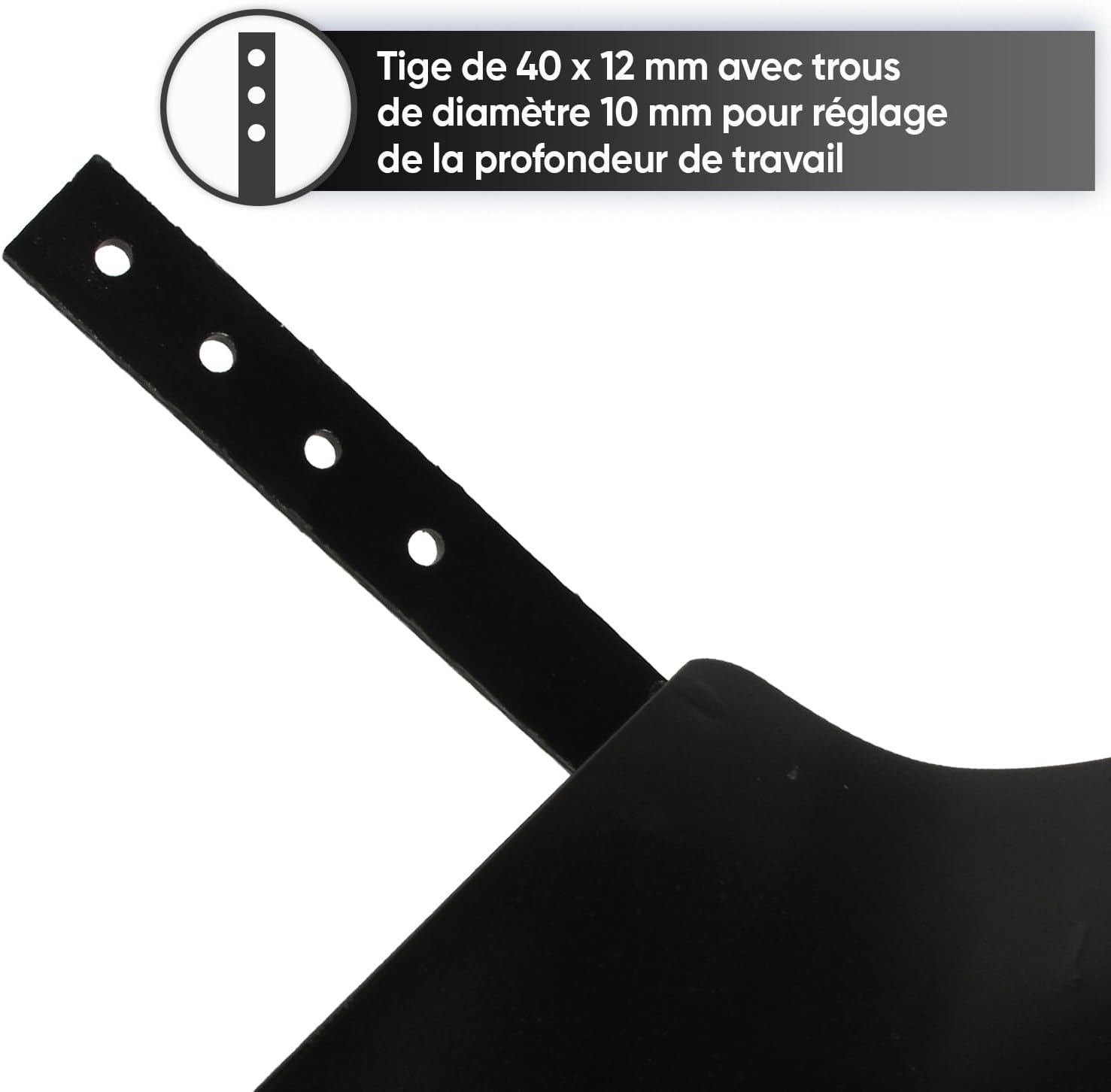 - Einzel-Pflug (225 x 70 mm), mit Ausgiesser von 33 cm. 40 x 12 mm Schaft mit Bohrungen mit einem Durchmesser von 10 mm.