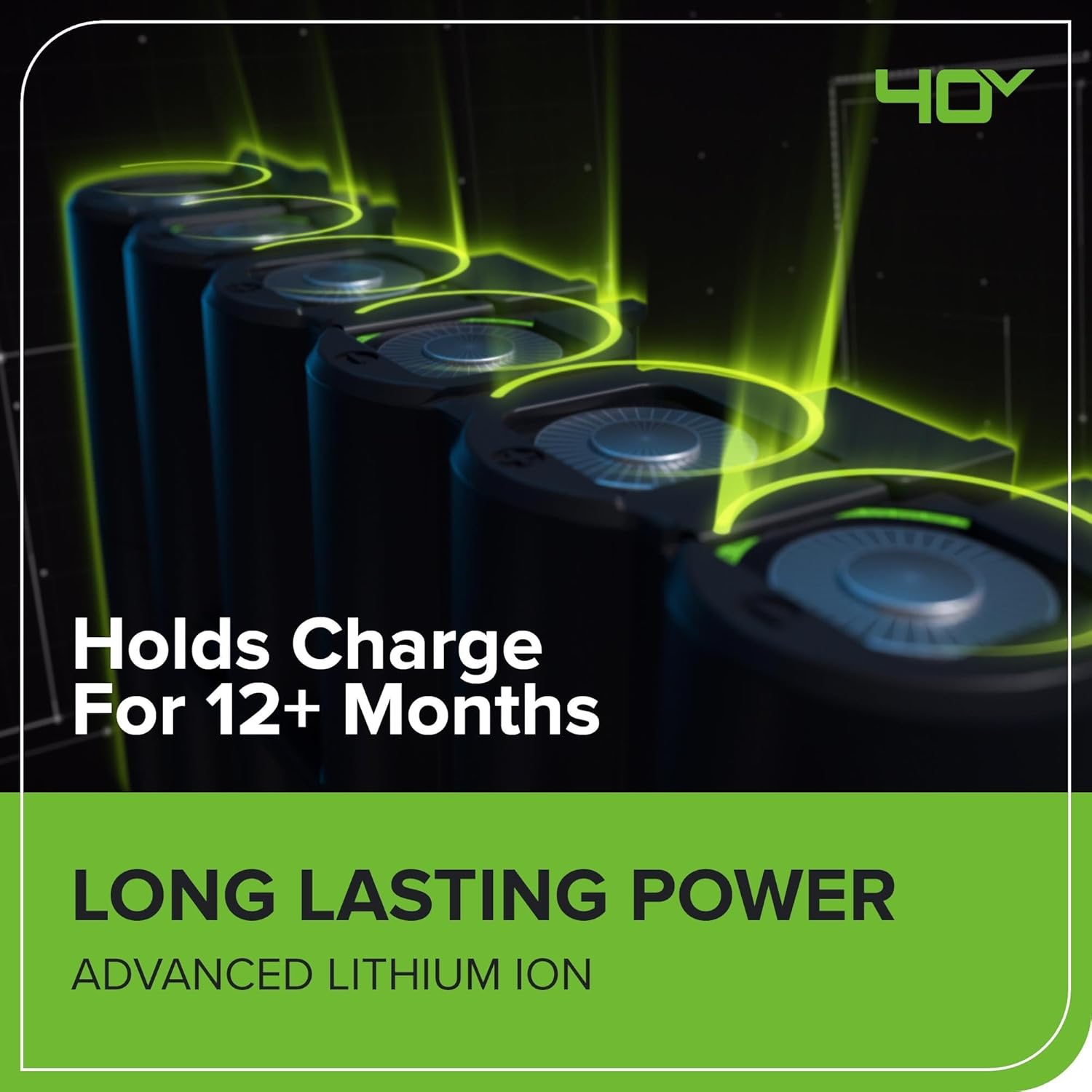 • LITHIUM-BATTERIE DER NEUEN GENERATION 40V 2Ah - angetrieben von einem fortschrittlichen Akku, den Sie in jedem Greenworks 40V Werkzeug verwenden können, um Abfall zu vermeiden und Geld und Platz zu sparen