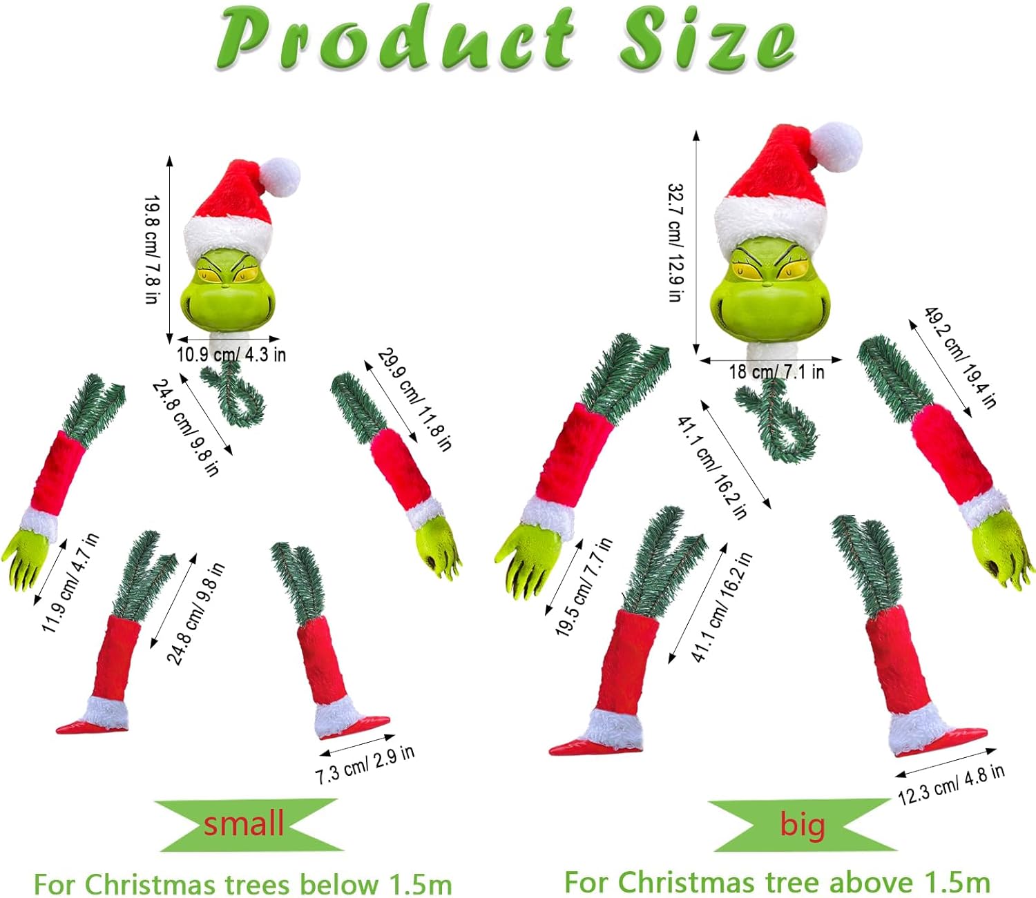 - Abnehmbares Design - Nach dem Kauf erhalten Sie den Elfenkopf x 1, die Arme x 2 und die Beine x 2, so dass Sie einen kompletten Grinch erhalten. Jedes Teil ist mit grünen Ranken versehen, so dass Sie es leicht am Weihnachtsbaum anbringen können und es
