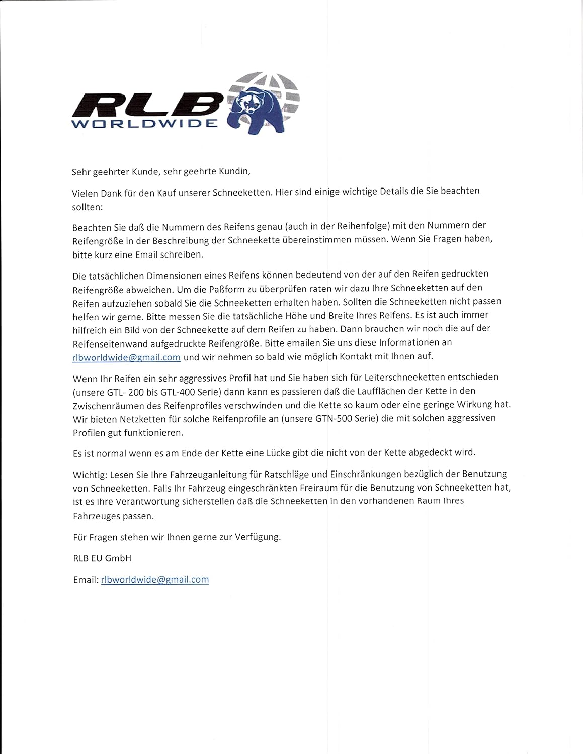 - Diese Schneeketten sind nicht für Reifen mit sehr aggressivem Profil geeignet. Bitte benutzen Sie Netzketten (GTN-500 Serie) dafür.